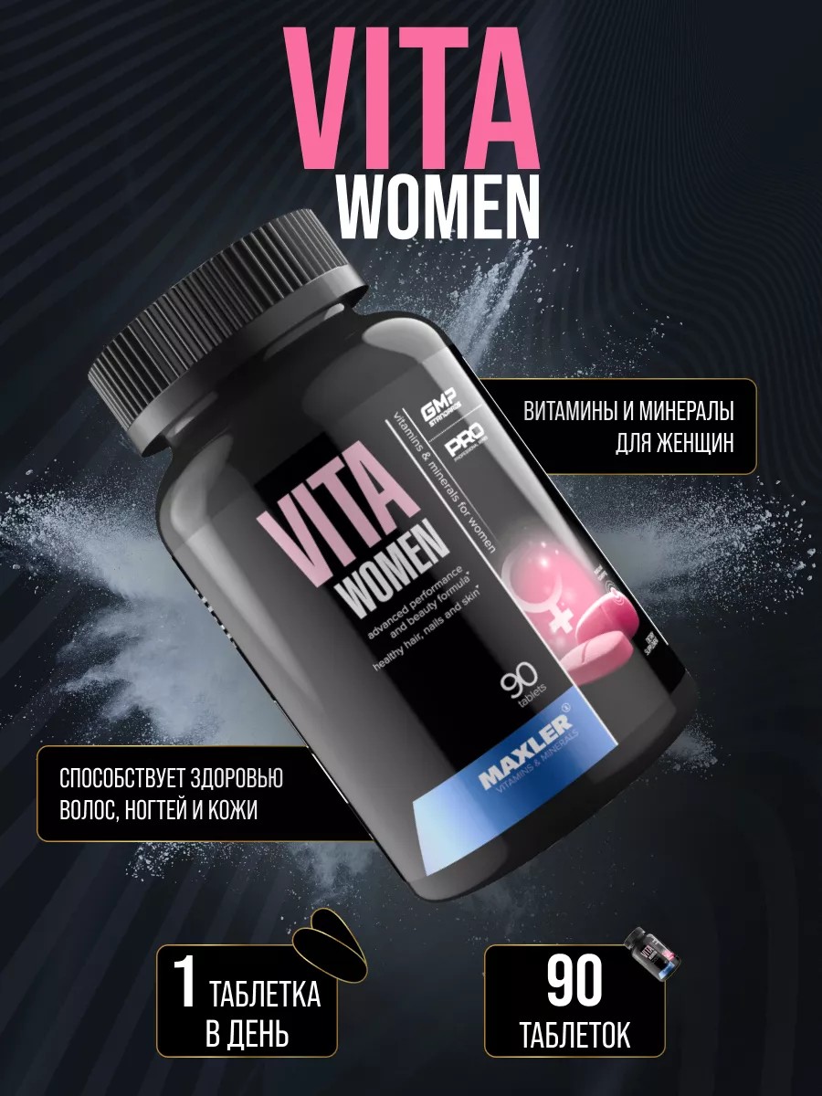 Витаминный комплекс Maxler Vita Women 90 таблеток создан для женщин, ведущих активный образ жизни, будет полезен как молодым женщинам, так и в более старшем возрасте. Витамины для женщин после 50 являются обязательными к применению. Для женщин витамины и минералы от Макслер входящие в состав комплекса, подойдут для укрепления иммунитета, помогут пищеварительной системе, дадут дополнительный заряд энергии, спокойствие и уверенность. Женские витамины Витавумен содержат увеличенное количество Биотина и Фолиевой кислоты, поэтому ценны как витамины для волос и ногтей, борются со старением кожи. Комплекс витаминов для женщин Maxler VitaWomen Вита Вумен - это сбалансированный комплекс витаминов и минералов, который поможет поддержать иммунную систему, бороться со стрессом, достичь красоты и здоровья кожи, волос и ногтей. **Применение:** 1-3 таблетки в день во время приема пищи.