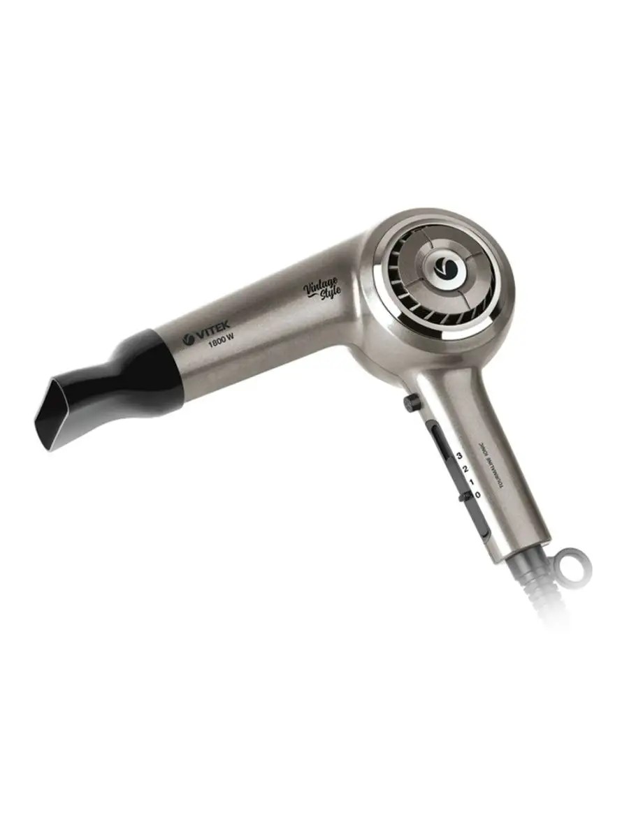 Фен Vitek VT-8230 обращает на себя внимание необычным дизайном: решётка воздухозаборника расположена не в торцевой части корпуса, а в боковой. Такое конструктивное решение позволило сделать прибор более плоским и компактным. ЭФФЕКТИВНЫЙ И ЭРГОНОМИЧНЫЙ Это удобная модель с довольно высокой мощностью 1800 Вт, чего вполне достаточно для быстрой сушки и укладки в домашних условиях даже длинных волос. К вашим услугам три режима температуры/интенсивности потока воздуха, что даст возможность без труда подобрать подходящий именно для вас вариант. Регулятор удобно расположен на рукоятке, так что менять настройки вы сможете одним движением пальца.