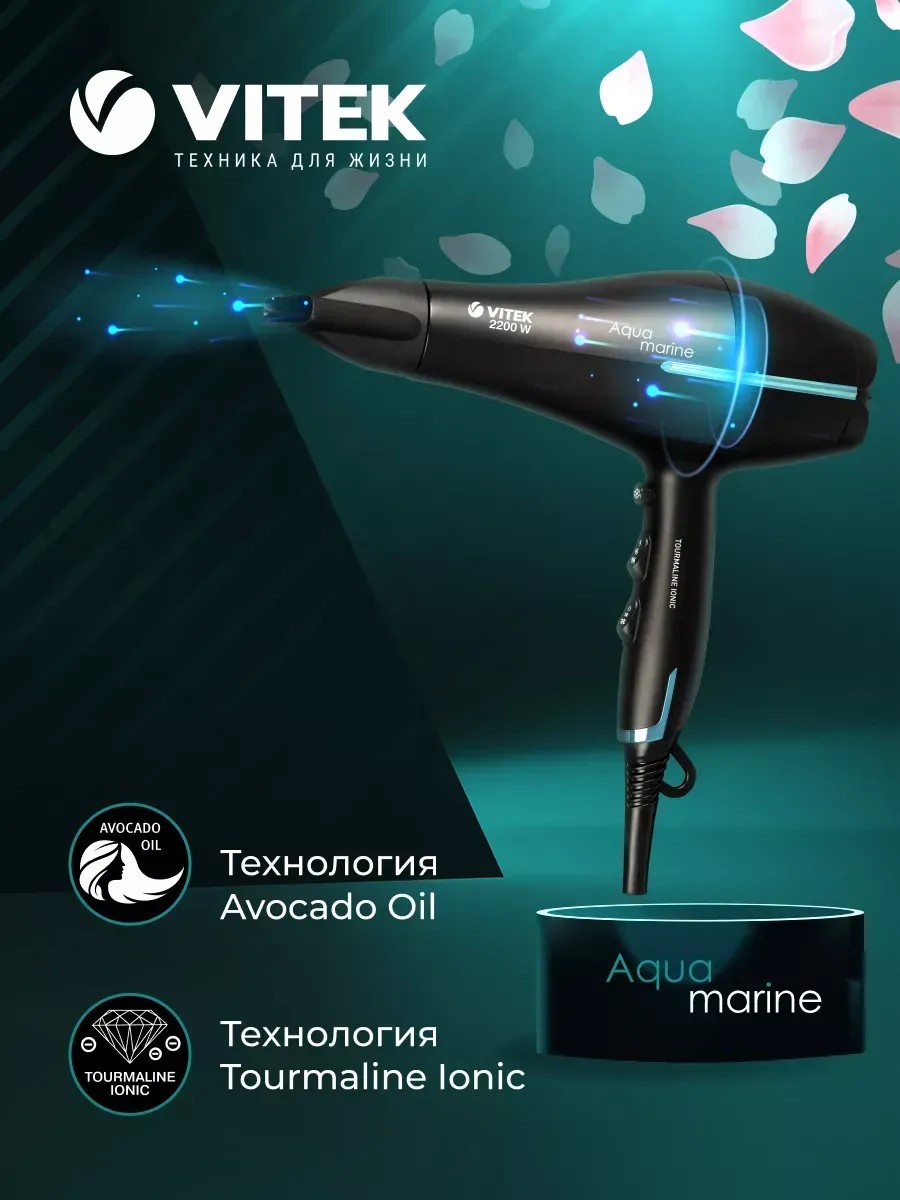 Do you love modern, high-tech appliances that help you take care of your beauty every day? Then the VITEK VT-8216 hair dryer with a maximum power of 2200W is just what you need! It features a professional AC motor, ensuring reliability and durability. This is further enhanced by a special overheat protection feature. The hair dryer grille is coated with a Tourmaline Ionic coating, which generates negative ions when heated, eliminating static electricity and literally sealing the hair cuticle. Avocado Oil technology also promotes healthy hair, leaving it soft, manageable, and shiny. You can choose from three temperature settings and two airflow speeds. This hair dryer allows you to style your hair the way you like: the concentrator allows you to target specific strands. A cool shot function helps set your hairstyle. The hair dryer is extremely comfortable to use thanks to its 1.8 m swivel cord. It has a removable filter that's easy to rinse with water. After use, the device can be hung anywhere using the special loop. Buy the VITEK VT-8216 hair dryer—a convenient device that will help you always look great!