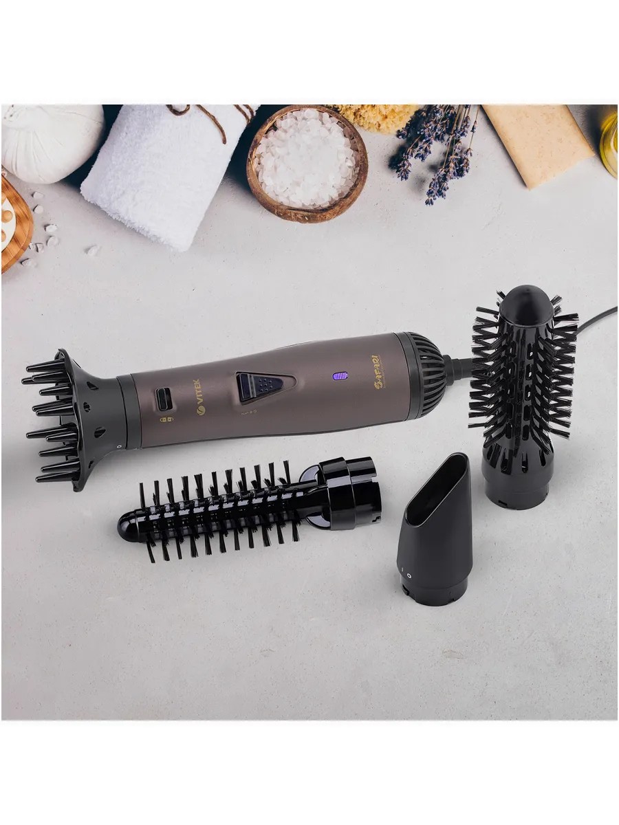 Не только высушить волосы, но и красиво уложить их позволит вам фен-щетка VITEK VT-8241, оснащенная тремя режимами температуры/ скоростями воздушного потока. Прибор имеет 2 термощётки диаметром 20 мм и 33 мм, которые помогут создавать изящные локоны, а также концентратор, направляющий воздух на определенные пряди, и диффузор, отвечающий за объем прически. Хотите зафиксировать созданную красивую укладку? Воспользуйтесь режимом подачи холодного воздуха!