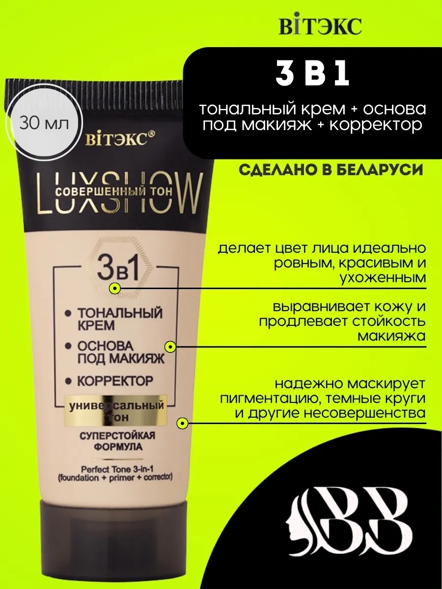 LuxShow Совершенный тон 3в1 — идеальное решение для безупречного макияжа, который подчеркивает вашу натуральную красоту и дарит коже здоровье и сияние. Этот универсальный тональный крем от известного бренда Витэкс совмещает в себе три важные функции: тональный крем, основу под макияж и корректор. Благодаря уникальной формуле, он подходит для любого типа кожи и обеспечивает идеальное покрытие на весь день.