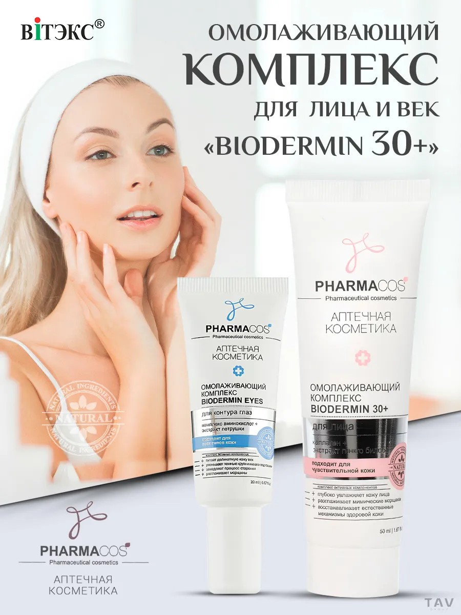 Линия Pharmacos — многофункциональная система аптечных средств по уходу за кожей лица. Передовые достижения в области косметической продукции в сочетании с натуральными компонентами нацелены на борьбу с основными проблемами кожи лица: устраняют раздражение и покраснение кожи, восстанавливают природный жировой баланс, регулируют микроциркуляцию, предотвращают появление акне, способствуют выведению токсинов, активно отбеливают кожу, предотвращают появление морщин. В набор входит: Омолаживающий комплекс 30+ для лица. Активные компоненты омолаживающего биокомплекса глубоко увлажняют кожу лица, бережно разглаживая мимические морщинки и предотвращает появление новых, легко проникая в глубокие слои кожи. Омолаживающий комплекс для контура глаз. Крем для контура глаз бережно ухаживает за деликатной кожей век, разглаживая «гусиные лапки», снимает усталость, возвращая коже здоровое сияние, эффективно уменьшает темные круги и мешки под глазами, разглаживают морщины, выравнивая текстуру кожи. Благодаря использованию крема кожа разглаживается, отечность уменьшается, а взгляд становится свежим и отдохнувшим.