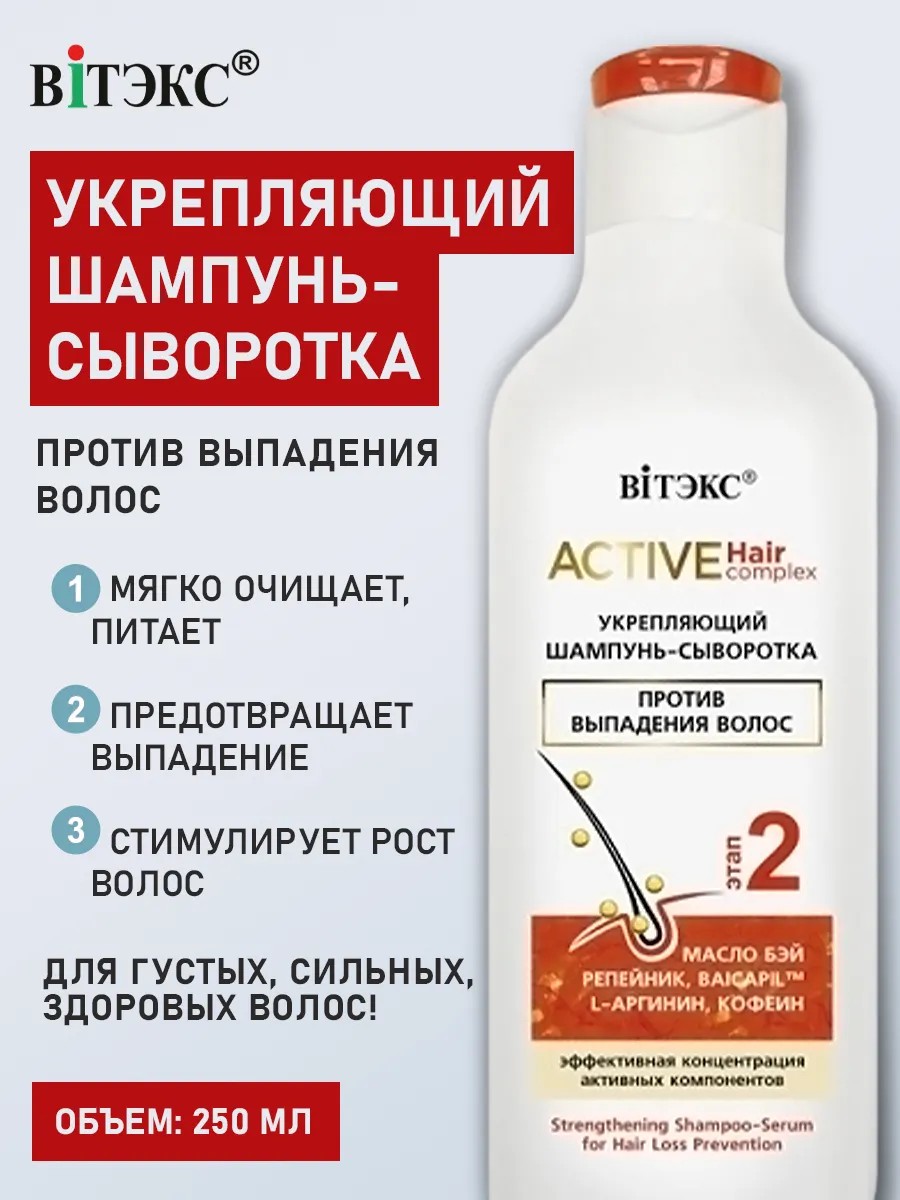 Шампунь для волос против выпадения ACTIVE Hair Complex от белорусского бренда Витекс — это профессиональный уход за волосами, разработанный для решения проблемы выпадения и стимуляции роста волос. Формула шампуня, обогащенная экстрактами лопуха, моринги, сои, пшеницы и шлемника байкальского, бережно очищает кожу головы и волосы, укрепляя их структуру изнутри. Аргинин и кофеин в составе шампуня активизируют кровообращение в коже головы, способствуя доставке питательных веществ к волосяным фолликулам и стимулируя их рост. Шампунь женский подходит для всех типов волос, в том числе для поврежденных и сухих, и эффективно борется с выпадением волос у женщин и мужчин. Укрепляющий шампунь-сыворотка против выпадения волос обеспечивает глубокое очищение, укрепление и питание волос, делая их более густыми, сильными и блестящими. Белорусская косметика линии ACTIVE HairComplex от Vitex – это интенсивная программа против выпадения волос с эффективной концентрацией активных компонентов. Регулярное использование шампуня для роста волос поможет вам вернуть локонам силу, здоровье и естественную красоту.