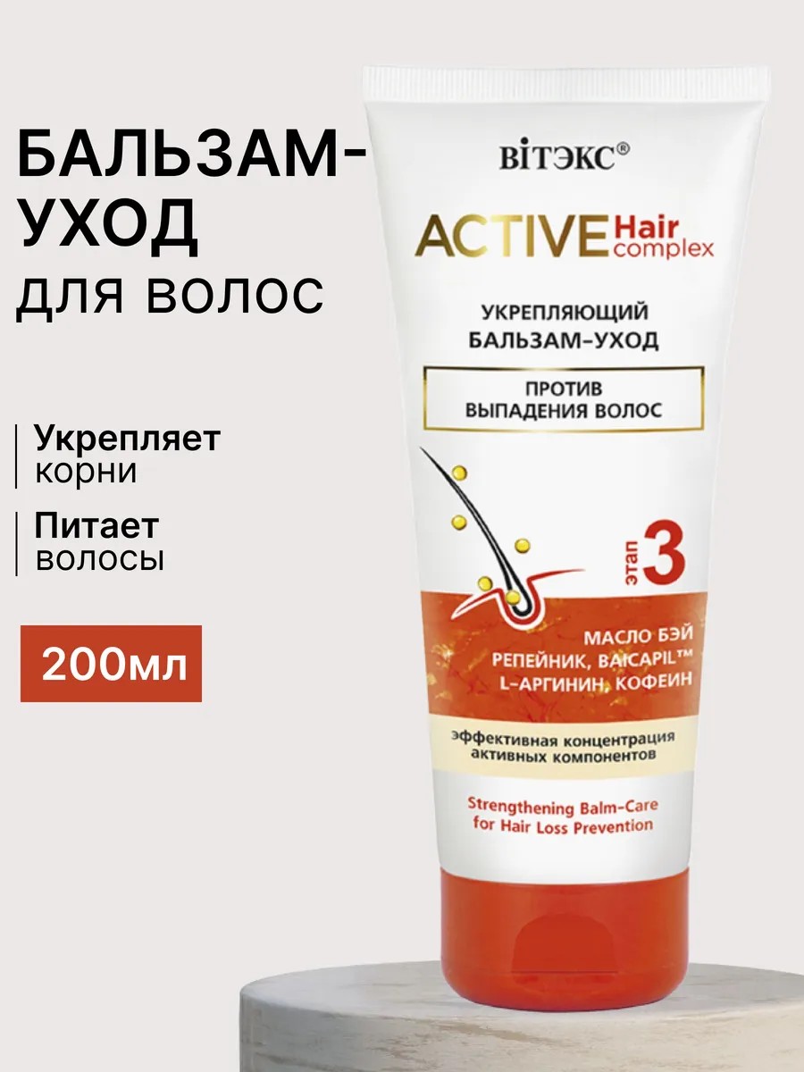 Укрепляющий бальзам для волос Active Hair Complex от белорусского бренда Витекс — это профессиональный уход, разработанный специально для восстановления, укрепления и стимуляции роста волос. Бальзам станет незаменимым помощником в уходе за поврежденными, тонкими и склонными к выпадению волосами. Уходовая косметика обогащена натуральными экстрактами, такими как экстракт лопуха, моринги, сои, пшеницы и шлемника байкальского, которые оказывают глубокое питательное и восстанавливающее действие. Кофеин в составе бальзама стимулирует кровообращение в коже головы, способствуя росту новых волос. Бальзам против выпадения волос не только укрепляет, но и придает им блеск, мягкость и шелковистость. Бальзам для роста волос подходит для всех типов кожи головы, в том числе для нормальной и сухой. Регулярное использование бальзама поможет вам вернуть волосам силу, здоровье и естественную красоту. Белорусская косметика линии Active Hair Complex от Vitex обеспечивает комплексный уход за волосами, помогая им стать более сильными, густыми и блестящими. Благодаря своим увлажняющим свойствам, бальзам делает волосы более послушными и легко расчесываемыми, предотвращая ломкость и сечение.