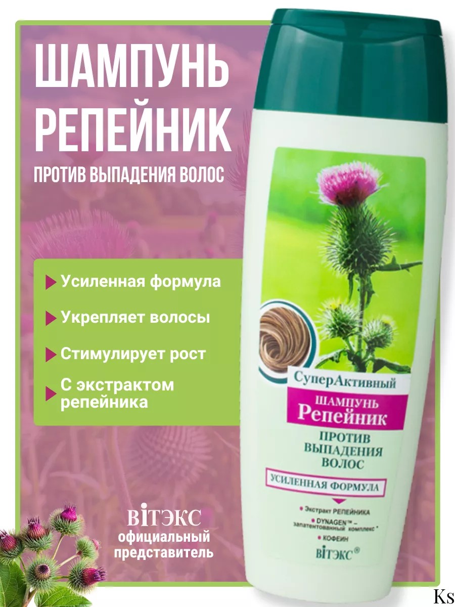 СуперАктивный шампунь Репейник против выпадения волос от белорусского бренда косметики Витэкс. Линия средств для ухода за волосами Репейник: помогает, если Ваши волосы требуют интенсивного лечения и восстановления. Решает проблемы: укрепления волос, стимулирования роста, придания им силы и жизненной энергии.