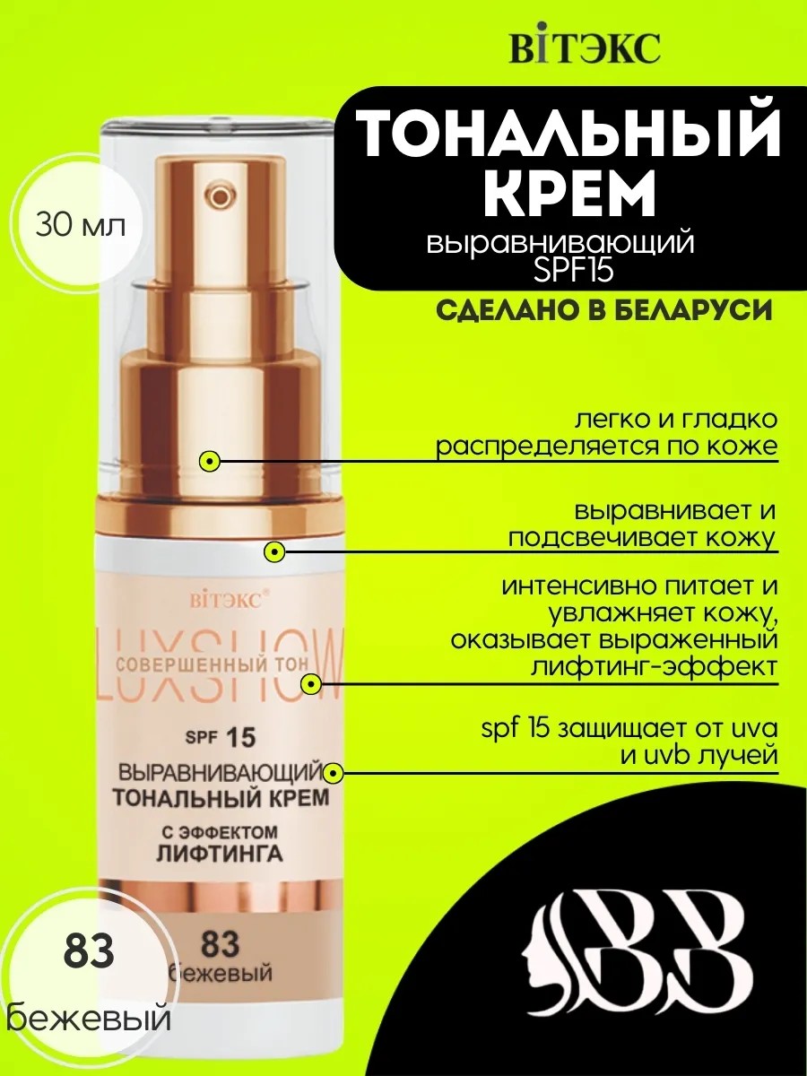 Выравнивающий тональный крем с эффектом лифтинга SPF15 Витэкс – это идеальное решение для тех, кто стремится к безупречному тону кожи и желает подчеркнуть свою природную красоту. Этот продукт создан с учетом современных потребностей, предоставляя вашему лицу не только равномерный цвет, но и заботу о его здоровье.