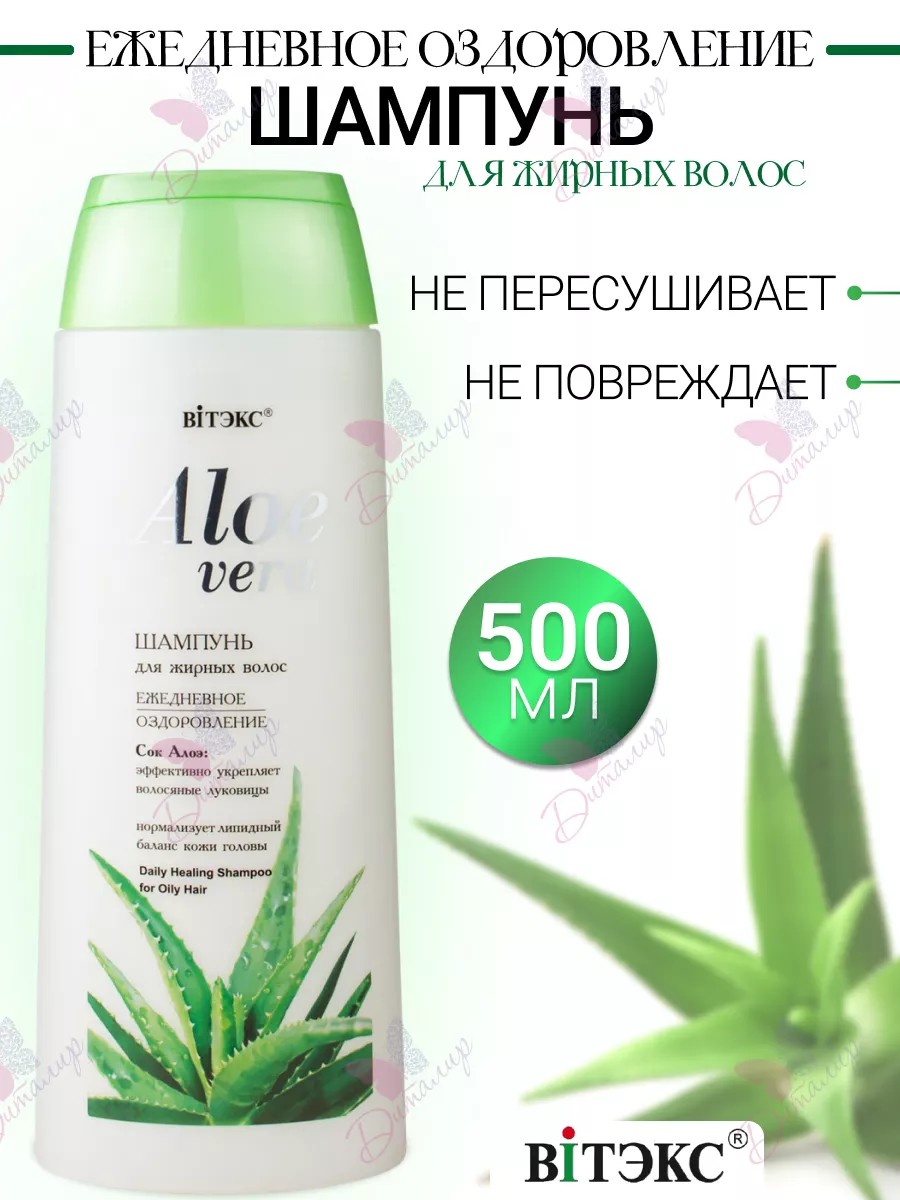 ALOE VERA Vitex Daily Wellness Shampoo for Oily Hair. This shampoo is specially formulated for daily care of oily and easily greasy hair. Its gentle complex of cleansing ingredients does not damage or dry out hair. Aloe vera juice strengthens hair follicles, normalizes sebum secretion, and restores the scalp's hydrolipid balance. Result: healthy and strong hair. Directions: Massage the shampoo into wet hair and scalp, then rinse with water. Repeat if necessary. For maximum results, use with conditioner.