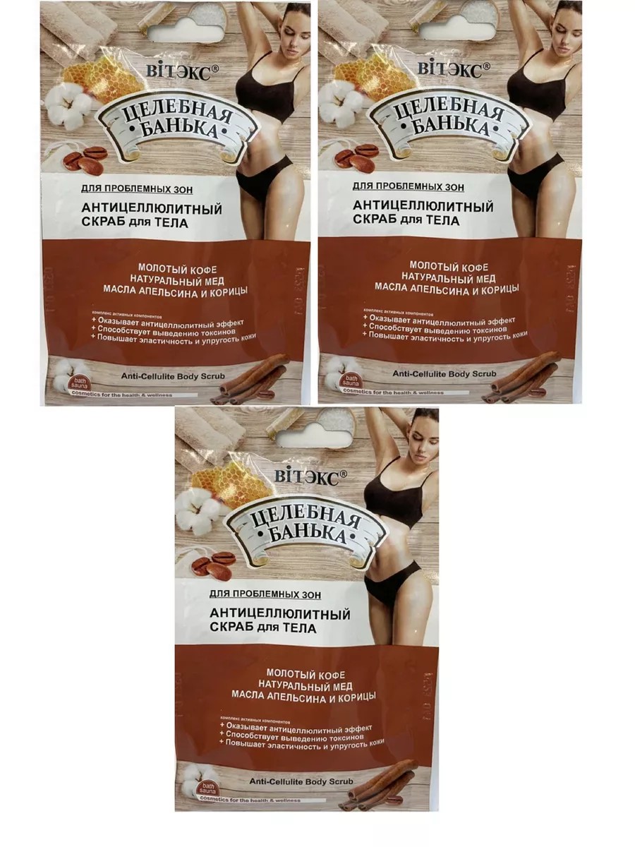 Vitex Anti-Cellulite Body Scrub, 40 ml Sachets, 3 pcs. The scrub's complex of active ingredients effectively combats cellulite and prepares the skin for intensive weight loss treatments. Honey is an amazing source of skin beauty: penetrating deep into the epidermis, it perfectly nourishes the skin, delivering essential vitamins and microelements to its cells. Ground coffee thoroughly exfoliates dead skin cells and gently massages the skin, leaving it surprisingly soft and smooth. Orange and cinnamon oils improve skin elasticity and firmness, effectively combat the appearance of cellulite, and cleanse cells of toxins. Caffeine improves circulation and has a firming and sculpting effect on problem areas such as the thighs and buttocks. The scrub's effect is enhanced when combined with a sauna.