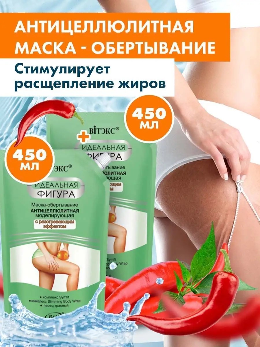 Обертывание антицеллюлитное для тела ВИТЕКС Маска крем с перцем горячая пленка набор для похудения.Инновационная формула маски-обертывания содержит запатентованный комплекс Symfit, благодаря которому обеспечивается тройной эффект:- усиливается расщепление жиров,- уменьшается заполнение жировых клеток жирами,- замедляется образование новых жировых клеток.Комплекс Slimming Body Wrap насыщает клетки активными микроэлементами, тонизирует и укрепляет структуру кожи, помогая совершенствовать тело. Масляный экстракт перца оказывает разогревающее действие. Это активизирует лимфоток, усиливает приток крови к проблемным зонам, улучшает обменные процессы. В результате ускоряется процесс проникновения активных компонентов в эпидермис, вместе с лишней жидкостью выводятся токсины и шлаки, что значительно повышает эффективность антицеллюлитных процедур.