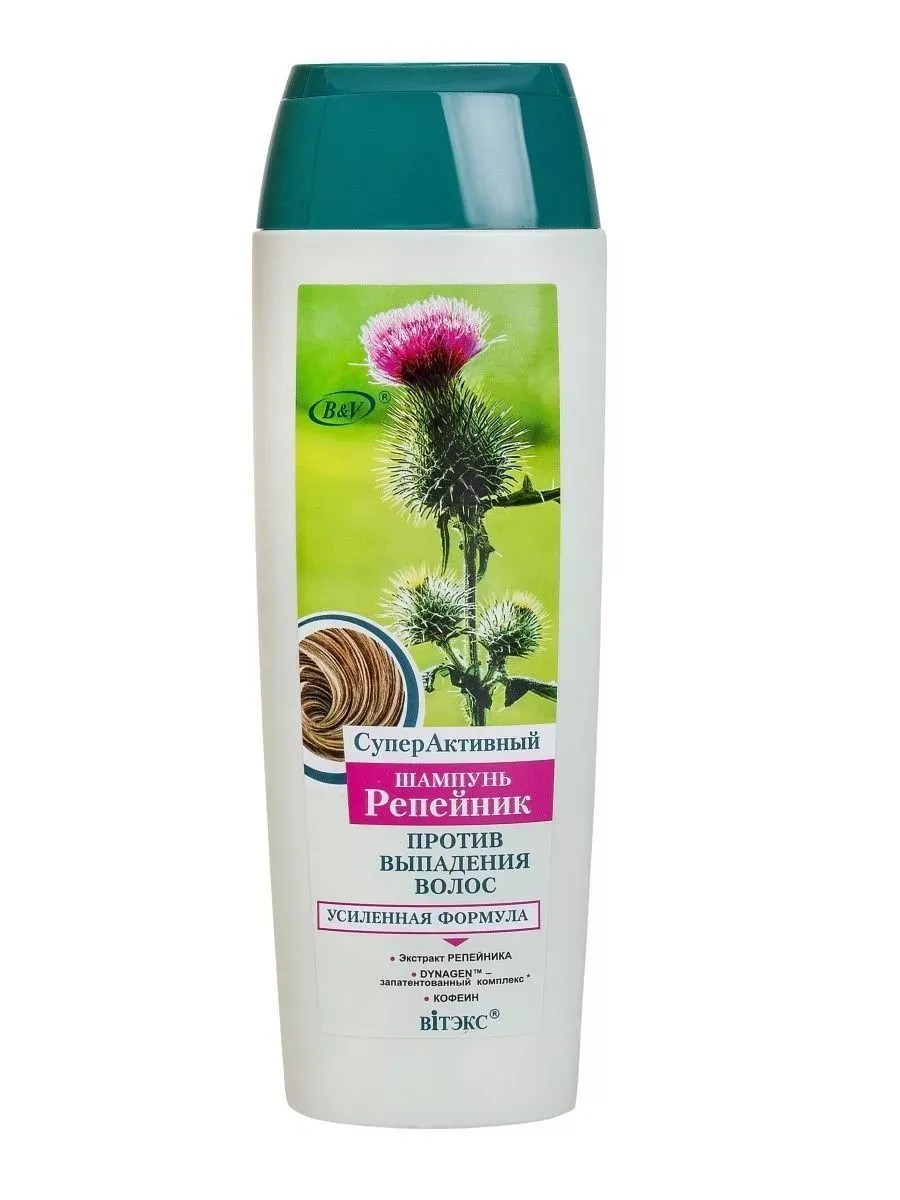 Вiтэкс, РЕПЕЙНИК Шампунь СуперАктивный, 400мл. Шампунь разработан специально для активной борьбы с выпадением волос и стимулирования их роста. Его усиленная формула основана на самых эффективных компонентах, используемых в косметологии. Укрепляющее действие натурального экстракта репейника дополнено действием питательных и стимулирующих рост волос компонентов - запатентованного комплекса DynagenТМ и кофеина. Подходит для ежедневного использования.