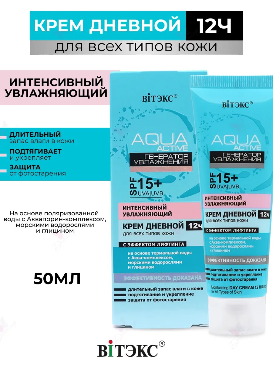 AQUA Active «Генератор увлажнения» Интенсивный увлажняющий крем дневной 12ч с эффектом лифтинга Витэкс. Защита SPF 15. Идеальный крем для комплексного ухода за кожей лица: увлажняет и создает длительный запас влаги в коже подтягивает и укрепляет структуру кожи защищает от фотостарения (УФ-лучей). Видимый эффект: красивая сияющая кожа.