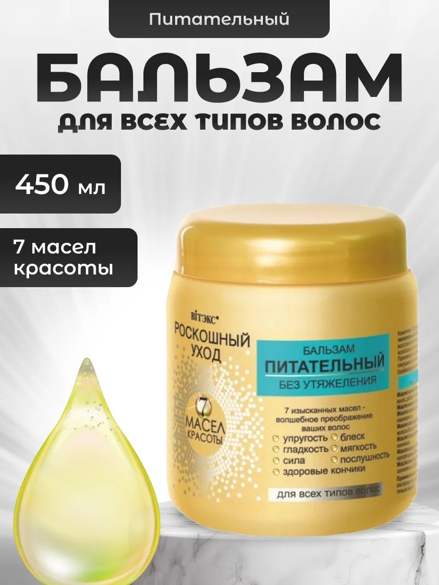 Белорусский женский бальзам Роскошный уход 7 Масел Красоты в банке каждый день обеспечивает глубокое питание и восстановление волос от корней до самых кончиков. Активные компоненты легкого питательного бальзама насыщают волосы и кожу головы полезными веществами, укрепляя корни и улучшая структуру волос, без утяжеления. Дарит волосам шелковистую мягкость, легкость и ослепительный блеск. Уникальная формула из семи целебных масел 7в1 проникает в кутикулу волоса, уменьшая ломкость, запаивает секущиеся поврежденные кончики, улучшает расчесывание. Особая формула средства не утяжеляет волосы, оставляя их легкими. Многовекторная система кондиционирования обеспечивает волосам дополнительный блеск, питание, увлажнение и объем, распутывает пряди, облегчает укладку, обладает антистатическим эффектом, делает локоны мягкими, здоровыми, густыми, блестящими и очень послушными. Способ применения: Нанести бальзам на чистые влажные волосы на 3-4 минуты, тщательно прополоснуть водой. Вы можете выбрать комплект с необходимым количеством средств внутри карточки. Пожалуйста, не стесняйтесь оставлять отзывы. Мы внимательно относимся к качеству товаров и обязательно дадим вам обратную связь.