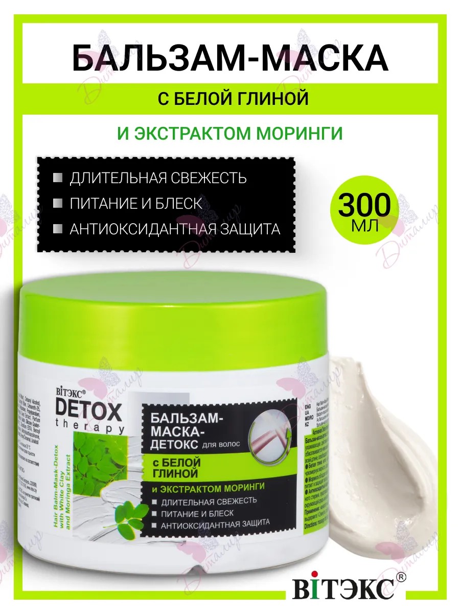 Бальзам-маска-детокс для волос с белой глиной и экстрактом моринги. Длительная свежесть. Питание и блеск - антиоксидантная защита. Бальзам-маска-детокс сочетает в себе легкость использования бальзама и интенсивное ухаживающее действие маски. Благодаря уникальной синергии активных компонентов волосы обволакиваются невесомой пленкой, которая питает, укрепляет и разглаживает волосы по всей длине, освобождает от токсинов и свободных радикалов, создает невидимую антиоксидантную защиту на каждом волоске, чтобы локоны наполнились легкостью и объемом, излучали естественный блеск, выглядели здоровыми от корней до кончиков. Белая глина мягко адсорбирует загрязнения и остатки косметических средств с волос и кожи головы, устраняет чрезмерную жирность, придает волосам длительную свежесть и легкость у корней. Моринга обладает исключительными смягчающими и увлажняющими свойствами, питает и защищает волосы, придавая им здоровый, ухоженный вид. Антиоксидантный detox-комплекс создает защитный барьер на поверхности волосяного стержня, предотвращая разрушающее действие химических веществ и токсинов из окружающей среды на волосы и кожу головы. Не изменяет цвет волос. Применение: нанесите на вымытые волосы, через 1-2 мин. Смойте водой. Не изменяет цвет волос.