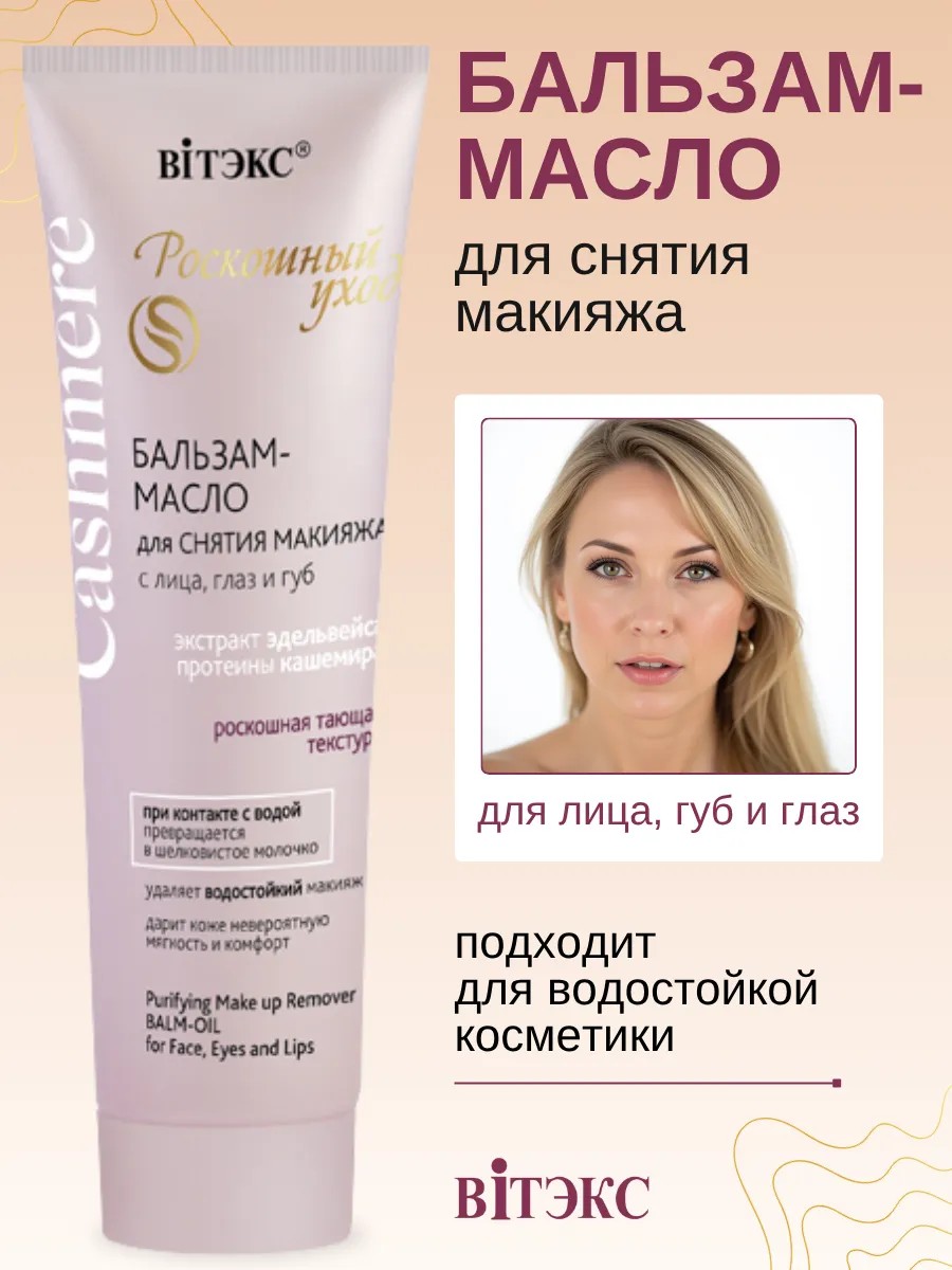 Бальзам- масло для снятия макияжа с лица глаз и губ Cashmere Раскошный уход. Насладитесь роскошной текстурой насыщенного бальзама, который тает на коже и становится нежнейшим маслом, а при контакте с водой превращается в шелковистое молочко. Эффективные очищающие компоненты безупречно удаляют загрязнения и макияж, в том числе стойкий, с кожи лица и вокруг глаз. Богатый коктейль из драгоценных масел миндаля и кокоса, протеинов кашемира и экстракта альпийского эдельвейса питает и увлажняет кожу во время очищения, защищает от пересушивания, придает абсолютный комфорт. Впечатляющий результат: изумительно мягкая, нежная, гладкая кожа, сияющая чистотой и свежестью. Удаляет водостойкий макияж, дарит коже невероятную мягкость и комфорт.