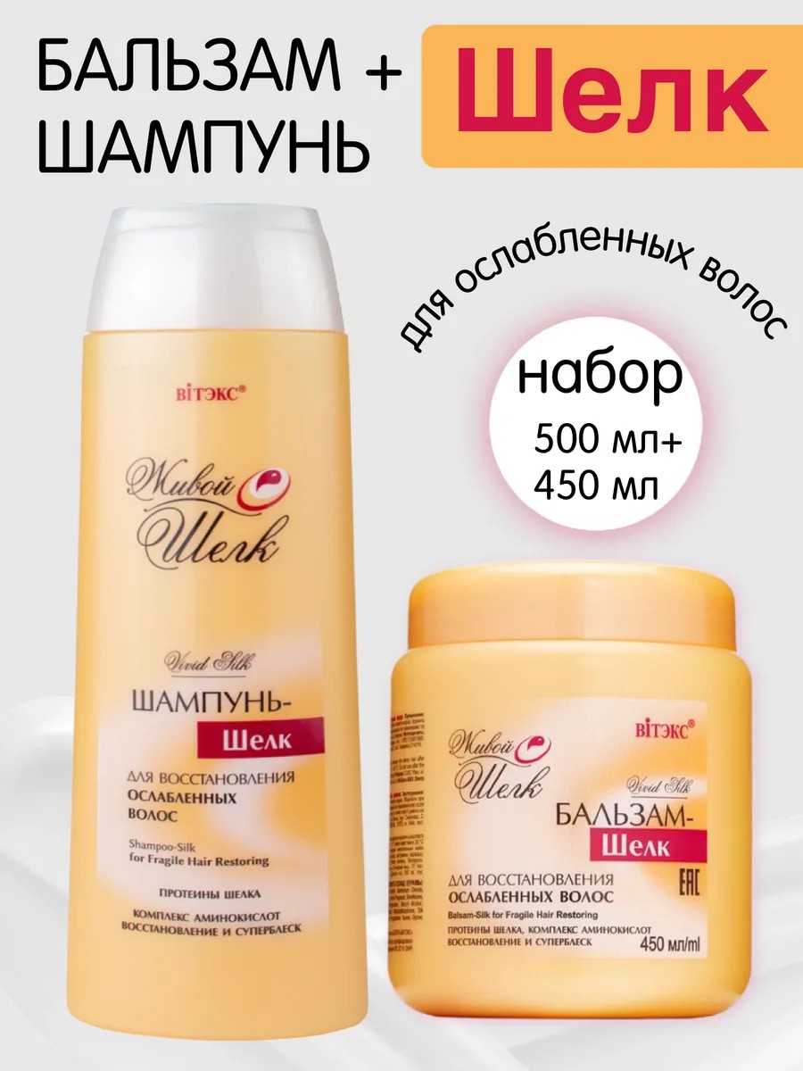 Шампунь с бальзамом - это Косметическая серия Живой шелк от беларуского бренда Витэкс подарит вам полноценный уход за поврежденными и ломкими волосами, поможет восстановить их структуру по всей длине. В основе бальзама для ослабленных волос - натуральные протеины шелка, которые способствуют укреплению и возвращению живого блеска лишенным жизни прядям. Интенсивная формула бальзама Живой шелк идеально подходит для ухода за длинными, ломкими и лишенными блеска волосами. Протеины шелка способствуют выравниванию и восстановлению структуры волос по всей длине, глубоко питая и увлажняя их, возвращая силу и упругость. Если ваши волосы были повреждены в результате химической завивки, окрашивания или обесцвечивания, лучшего средства по уходу за локонами, чем бальзам Живой шелк вы не сможете найти. Способ применения: нанесите бальзам на влажные вымытые волосы, распределите равномерно по всей длине, оставьте на 1-2 минуты, смойте водой.