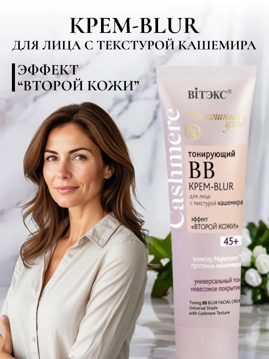 Витэкс Cashmere 45+ BB Крем-blur для лица Тонирующий с текстурой кашемира, тон универсальный. Интеллектуальная формула обладает всеми преимуществами полноценного ухаживающего антивозрастного крема, безупречно маскирует несовершенства и улучшает цвет лица, как ВВ-крем кашемир, визуально стирает поры и неровности, подобно BLUR-эффекту в фотофильтрах. Мощный комплекс передовых компонентов с усиленным антивозрастным действием работает не только на поверхности кожи, но и в глубоких слоях, эффективно борется со всеми признаками старения кожи во время каждого нанесения крема: протеины кашемира увлажняют и питают кожу, дарят мягкость и нежность; омолаживающий эликсир Majestemтм разглаживает и подтягивает кожу, замораживая морщины, препятствует появлению признаков возраста. Пигменты натурального оттенка мгновенно подстраиваются под естественный оттенок лица, минимизируя видимость мелких морщинок, пор и пигментации и обеспечивая безупречное покрытие с эффектом второй кожи на весь день. Ультратонкая текстура создает комфортное невесомое покрытие, абсолютно незаметное на коже, позволяет сохранить безукоризненную свежесть макияжа на весь день.