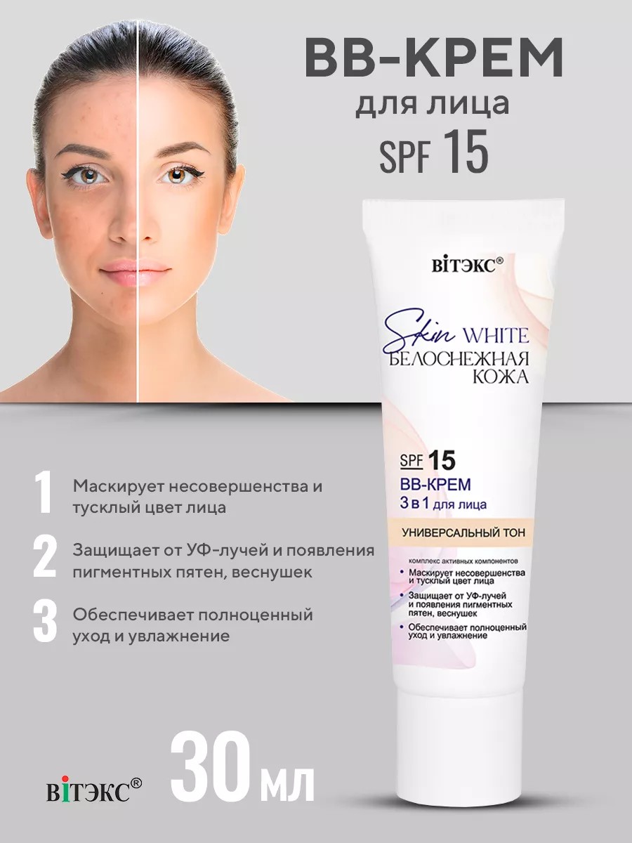 3-in-1 BB Cream for Face SPF 15 Universal Foundation. Conceals imperfections and a dull complexion. Protects against UV rays and the appearance of age spots and freckles. Provides complete care and hydration. 3-in-1 result: 1. Evens skin tone, conceals redness, age spots, freckles, dark circles under the eyes, and other imperfections. 2. Whitens all types of pigmentation, as well as freckles and post-acne spots, thanks to the highly active Premium White complex, alpha-ARBUTIN, and niacinamide. 3. Reliable protection from UV rays and photoaging. Alpha-ARBUTIN is one of the most effective and safe ingredients for combating pigmentation and uneven skin tone. Inhibits melanin production, lightens dark circles, protects against the negative impact of external factors, and leaves skin smooth, even, and well-groomed. Niacinamide reduces pigmentation, stimulates collagen and elastin production, tightens pores, and improves complexion. Directions: Apply a small amount to the face and spread evenly.
