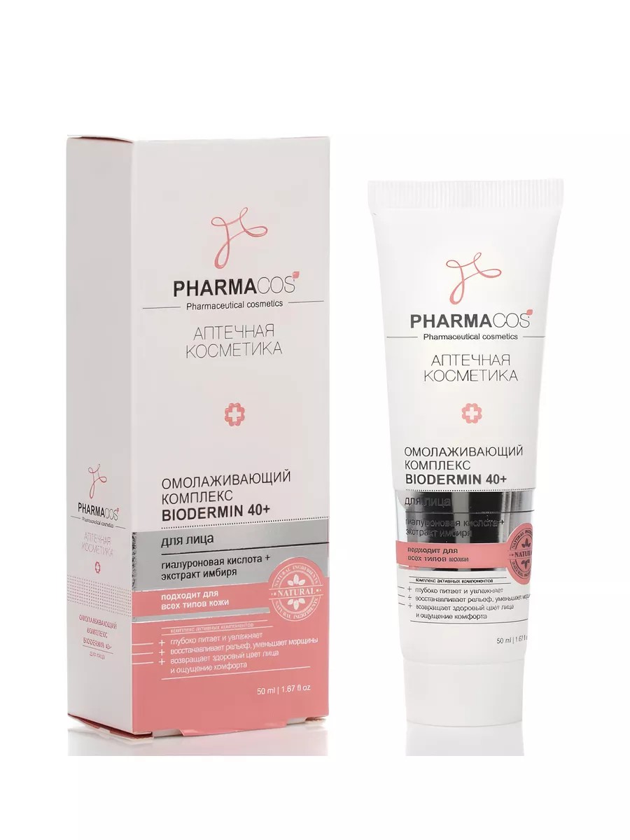 BIODERMIN 40+ Rejuvenating Facial Complex. The active ingredients of this rejuvenating biocomplex deeply nourish and moisturize the skin, restoring a healthy complexion and a feeling of comfort. Thanks to the cream's special formula, wrinkles are smoothed out, and the skin becomes smooth and elastic. Hyaluronic acid restores the skin's moisture balance, slows the aging process, and helps effectively reduce the depth of wrinkles, increasing skin elasticity.