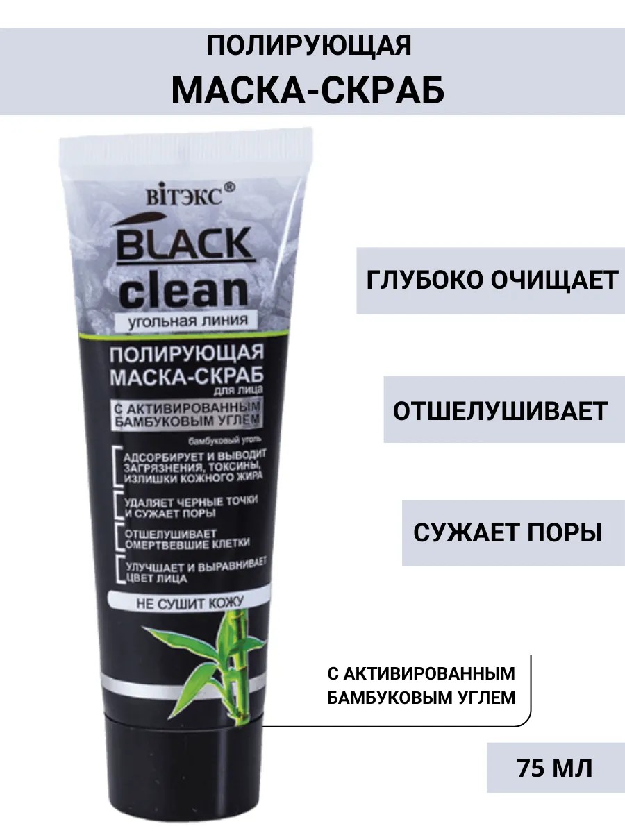 Полирующая маска-скраб с активированным бамбуковым углем «Black Clean» от белорусского бренда Витекс — это идеальное средство для глубокого очищения и ухода за кожей лица. Уходовая косметика для лица эффективно борется с несовершенствами кожи, такими как черные точки и прыщи, при этом не сушит кожу, что делает её подходящей даже для чувствительной кожи. Благодаря активированному бамбуковому углю маска от прыщей глубоко очищает поры, устраняя загрязнения и излишки себума. Диоксид кремния и каолин в составе маски для лица обеспечивают мягкий скрабирующий эффект, удаляя омертвевшие клетки кожи и придавая ей гладкость. Маска от черных точек с экстрактом шалфея, тысячелистника и нима помогают успокоить воспаления, способствуя улучшению состояния жирной кожи и предотвращая появление новых высыпаний. Регулярное использование маски способствует сужению пор на лице, что делает кожу более ровной и ухоженной. Уход за лицом с лецитином и аллантоином обеспечивает увлажнение и питание кожи, предотвращая её пересушивание. Маска для лица очищающая подходит для жирной и комбинированной кожи, эффективно борясь с черными точками и прыщами. Белорусская косметика линии «Black Clean» с добавлением бамбукового угля, подобно магниту, притягивает загрязнения, токсины, излишки кожного жира и выводит их из кожи. Используйте полирующую маску-скраб от Vitex как часть вашего ухода за лицом, чтобы добиться чистоты, свежести и здорового вида кожи. Черная маска для лица от черных точек на носу станет вашим надежным помощником в борьбе с несовершенствами кожи и подарит вам ощущение ухоженности!