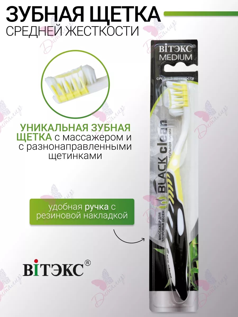 Medium-hard, ultra-fine bristles for deep and gentle cleaning of teeth and gums. Ideal for dental and gum care. Unlike regular toothbrushes, the Black Clean toothbrush with a massager and multi-directional medium-hard bristles more effectively removes plaque, while special rubber bristles gently massage gums during brushing. Advantages of the Black Clean toothbrush: allows better cleaning of teeth in hard-to-reach places; multi-directional bristles penetrate deep between teeth; helps improve gum health without damaging them during brushing; a special comfortable handle and rubber pad prevent the toothbrush from slipping in your hand. This toothbrush meets all dental care requirements. High-quality medium-hard fiber is used in the production of the toothbrush. Recommended for use with Black Clean toothpastes.