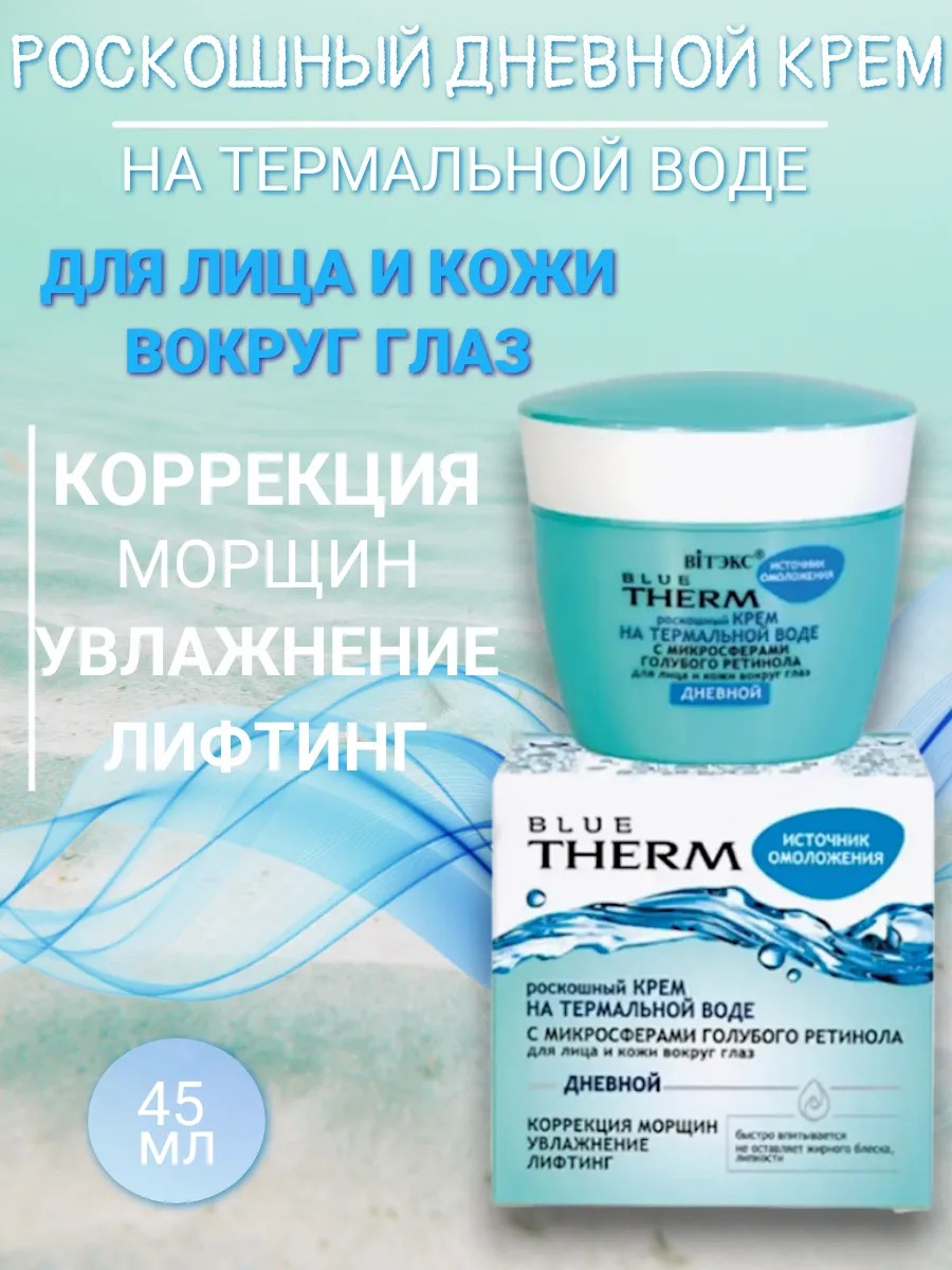 Крем для лица и кожи вокруг глаз Витэкс Blue Therm дневной, источник омоложения 45 мл. - восхитительно роскошный дневной крем на термальной воде с микросферами голубого ретинола для лица и кожи вокруг глаз, с бархатистой текстурой для интенсивного питания, увлажнения и разглаживания кожи, с эффектом мгновенного лифтинга. Комплекс активных компонентов моментально и надолго насыщает, даже самую обезвоженную кожу, увлажняющими и питательными компонентами.