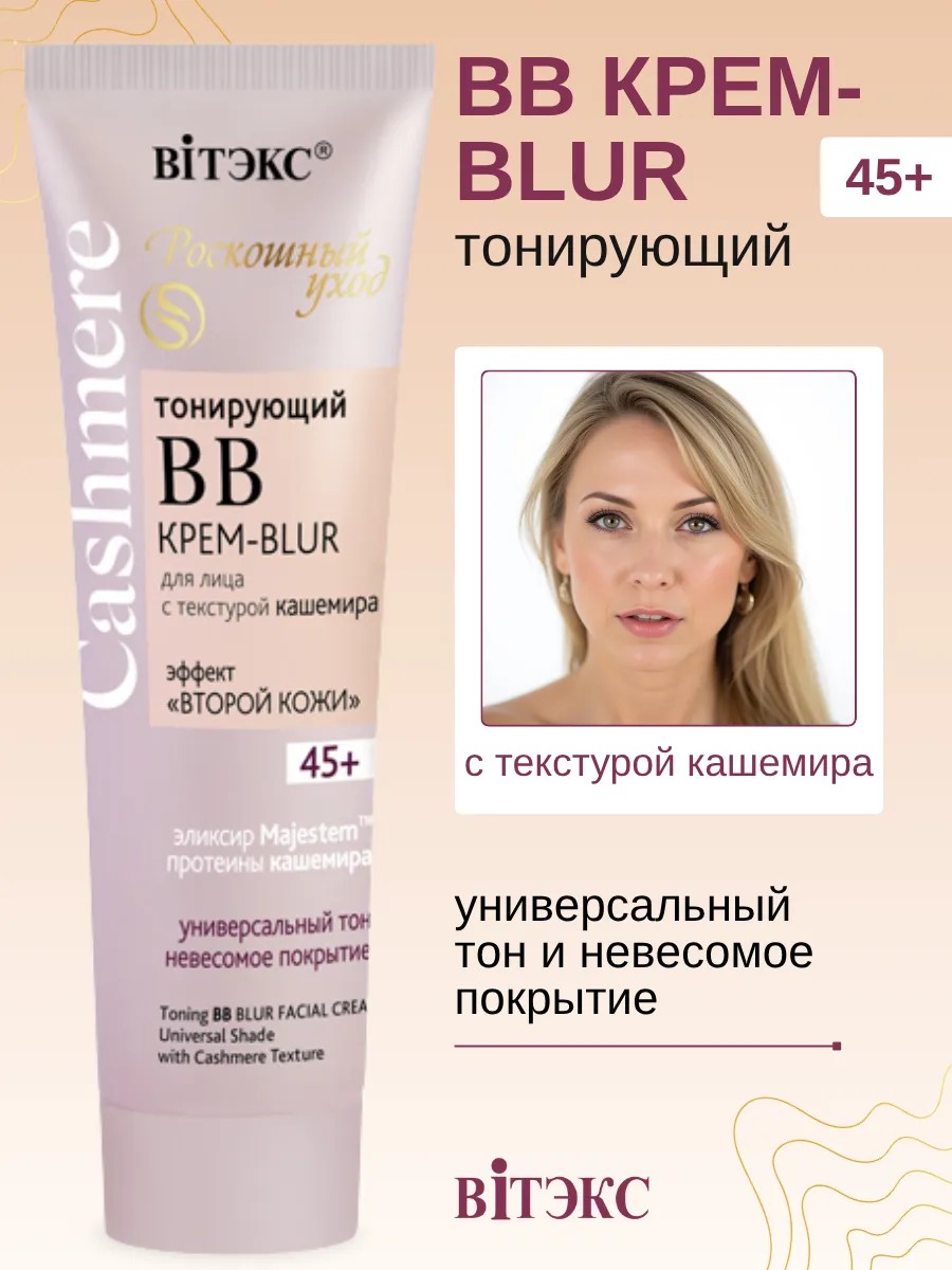 Тонирующий ВВ крем-BLUR для лица с текстурой кашемира 45+ Cashmere Раскошный уход. Интеллектуальная формула обладает всеми преимуществами полноценного ухаживающего антивозрастного крема, безупречно маскирует несовершенства и улучшает цвет лица, как ВВ-крем, визуально «стирает» поры и неровности, подобно BLUR-эффекту в фотофильтрах.