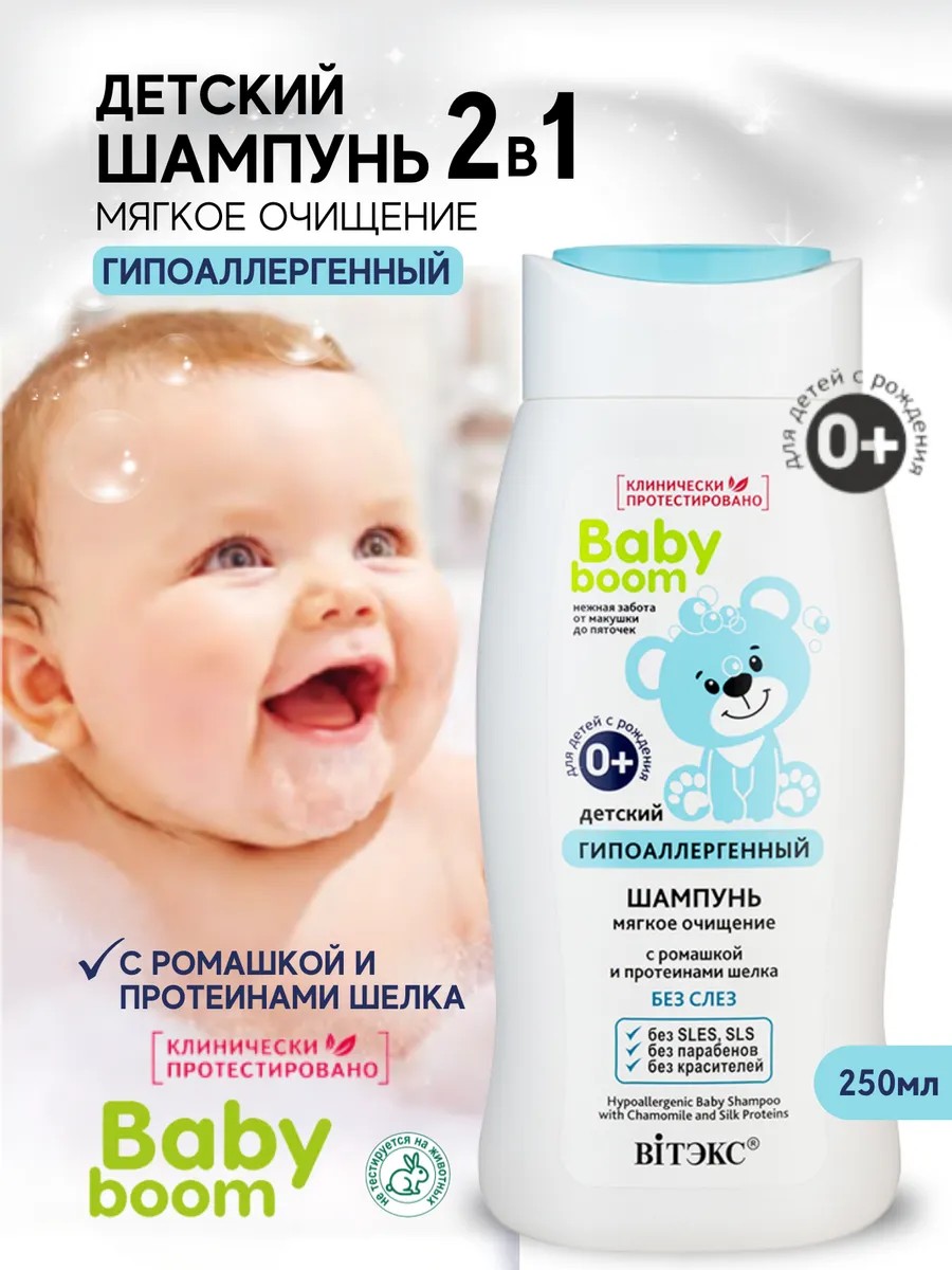 Мягкий шампунь с ГИПОАЛЛЕРГЕННОЙ ФОРМУЛОЙ заботливо приготовлен специалистами научного центра компании Витэкс для детей с первых дней жизни. Ультрамягкие натуральные очищающие компоненты образуют пышную кремовую пену, которая очень бережно очищает детские волосы и кожу головы, легко и полностью смывается, не щиплет и не раздражает глазки и носик. Ромашка оказывает противовоспалительное и успокаивающее действие на кожу головы, делает волосы мягкими и послушными. Протеины шелка придают волосам шелковистость и блеск. Масло хлопка и аллантоин глубоко увлажняют и питают кожу головы, стимулируют процессы регенерации.