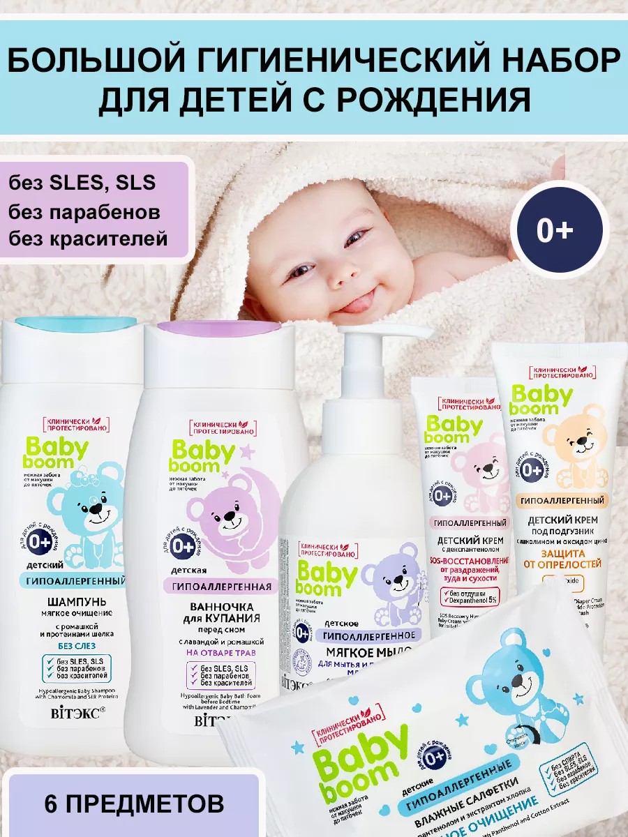 | Комплектация | шампунь; ванночка; мыло; Салфетки; крем под подгузник; крем от раздражений |