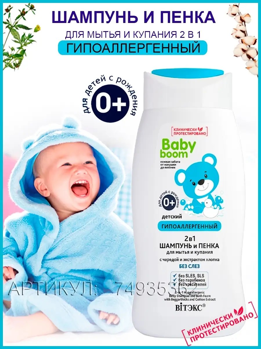 Ваш любимый малыш нуждается в нежности, ласке и правильном уходе, поэтому мы стремимся подарить ему лучшее, что даёт природа и современная наука. В научном центре компании ВИТЭКС специально для детей с рождения была создана линия гипоаллергенной косметики BABY BOOM. При создании линии были соблюдены самые строгие требования, которые предъявляют педиатры, ученые и заботливые родители к детской косметике. Детский шампунь гипоаллергенный без слез и пенка для купания 2в1 от ВИТЭКС идеально подходит для детей с первых дней жизни. Ультрамягкие натуральные компоненты образуют густую кремовую пену, которая очень бережно очищает детскую кожу и волосы, полностью смывается, не щиплет и не раздражает глазки и носик. Экстракт череды обладает успокаивающими, противовоспалительными и дезинфицирующими свойствами. Экстракт хлопка великолепно смягчает кожу, снимает раздражение и покраснение, дарит моментальный комфорт. НЕ СОДЕРЖИТ SLES и SLS, ПАРАБЕНОВ И КРАСИТЕЛЕЙ.