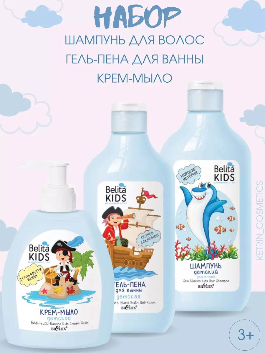 | Package contents | Children's hair SHAMPOO "Sea Stories" 300 ml; Bath GEL-FOAM "Treasure Island" 300 ml; Children's Cream-Soap "Tutti-Frutti-Banana" 300 ml |