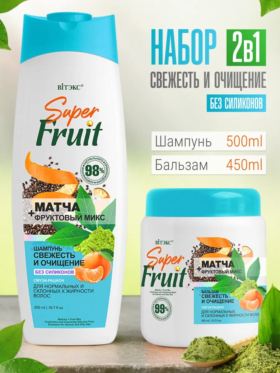 Подарите волосам красоту и здоровье с набором для очищения и свежести волос Super Fruit: шампунь и бальзам маска ополаскиватель.