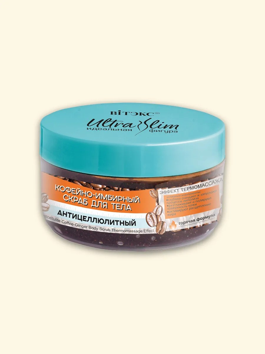 This coffee and ginger scrub combines deep cleansing and an intense anti-cellulite thermal massage. Natural coffee actively massages the skin, gently exfoliating dead skin cells, polishing and smoothing the skin. Ginger accelerates cellular metabolism, accelerates fat breakdown, stimulates renewal processes, and has a pronounced lifting and anti-cellulite effect. Red pepper increases blood flow to problem areas, activates microcirculation, promotes the removal of excess fluid and toxins from cells, and improves skin tone.