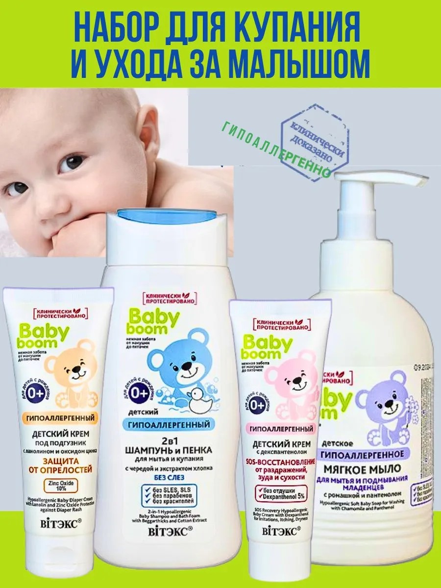Ваш любимый малыш нуждается в нежности, ласке и правильном уходе, поэтому мы стремимся подарить ему лучшее, что даёт природа и современная наука. Белорусская компания ВИТЭКС специально для детей с рождения создала линию гипоаллергенной косметики BABY BOOM. В набор бокс входит: шампунь пенка для мытья и купания, мягкое мыло для подмывания, крем под подгузник и крем ежедневный уход. Шампунь и пена с чередой и экстрактом хлопка обеспечивает нежное очищение кожи, создавая приятные ощущения. Шампунь без слез помогает бережно ухаживать за волосками, оставляя их послушными и блестящими. Нежная формула с гель алоэ вера, специально разработана для младенцев и обеспечивает максимально увлажняющее и укрепляющее действие. Мягкое мыло для мытья и подмывания содержит ромашку и пантенол, которые смягчают ее, не пересушивают и не раздражают слизистые, что очень важно при частой смене подгузника. Гипоаллергенный детский крем для ежедневного ухода имеет в составе череду и пантенол, которые питают и защищают, помогают сохранить естественный баланс с первых дней жизни. Отлично подходит для использования после купания. Крем под подгузник с ланолином и оксидом цинка создает защитный барьер, предотвращая появление раздражений и опрелостей. Эффективен и безопасен, обеспечивает комфорт в течение всего дня. Гигиенический уходовый набор отличный выбор для родителей, которые заботятся о здоровье своего малыша. В составе набора нет SLES и SLS, парабенов и красителей, что делает его безопасным для применения. Применяется для ежедневного использования и обеспечат вашему ребенку ощущение мягкости, комфорта и чистоты. Отличный подарок для родителей, подходит как для мальчиков, так и для девочек. Этот новогодний комплект содержит всю необходимую косметику с 0 лет и станет отличным подарком для выписки из роддома крестника. Подарок порадует маму, папу и младенца. Качество и безопасность этих средств подтверждены дерматологическим контролем.