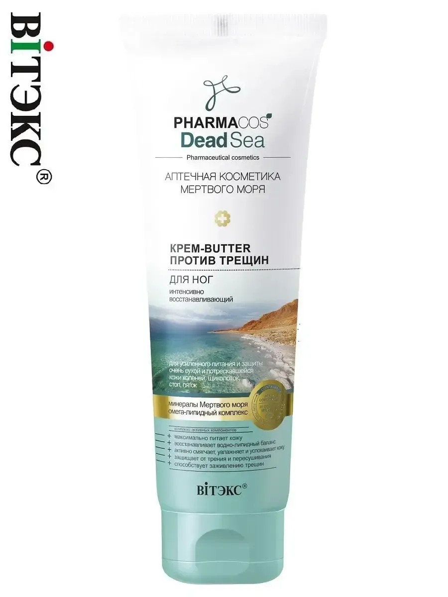VITEX PHARMACOS DEAD SEA Butter Foot Cream against Cracks, Restorative, 100ml, Dead Sea Minerals, Omega-Lipid Complex - Provides maximum nourishment to the skin; - Restores water-lipid balance; - Actively softens, moisturizes, and soothes the skin; - Protects from friction and dryness; - Promotes healing of cracks. For enhanced nourishment and protection of very dry and cracked skin of the knees, ankles, feet, and heels. This butter cream is specially designed for the care of foot skin prone to dryness and cracking. The rich formula contains a specially developed omega-lipid complex and healing Dead Sea minerals for intensive restoration, softening, and healing of the foot skin. Active ingredients: Microcrystals of 20 Dead Sea minerals restore the water-lipid and mineral balance in cells, strengthen the skin's defense mechanisms, tone, and improve elasticity and smoothness.
