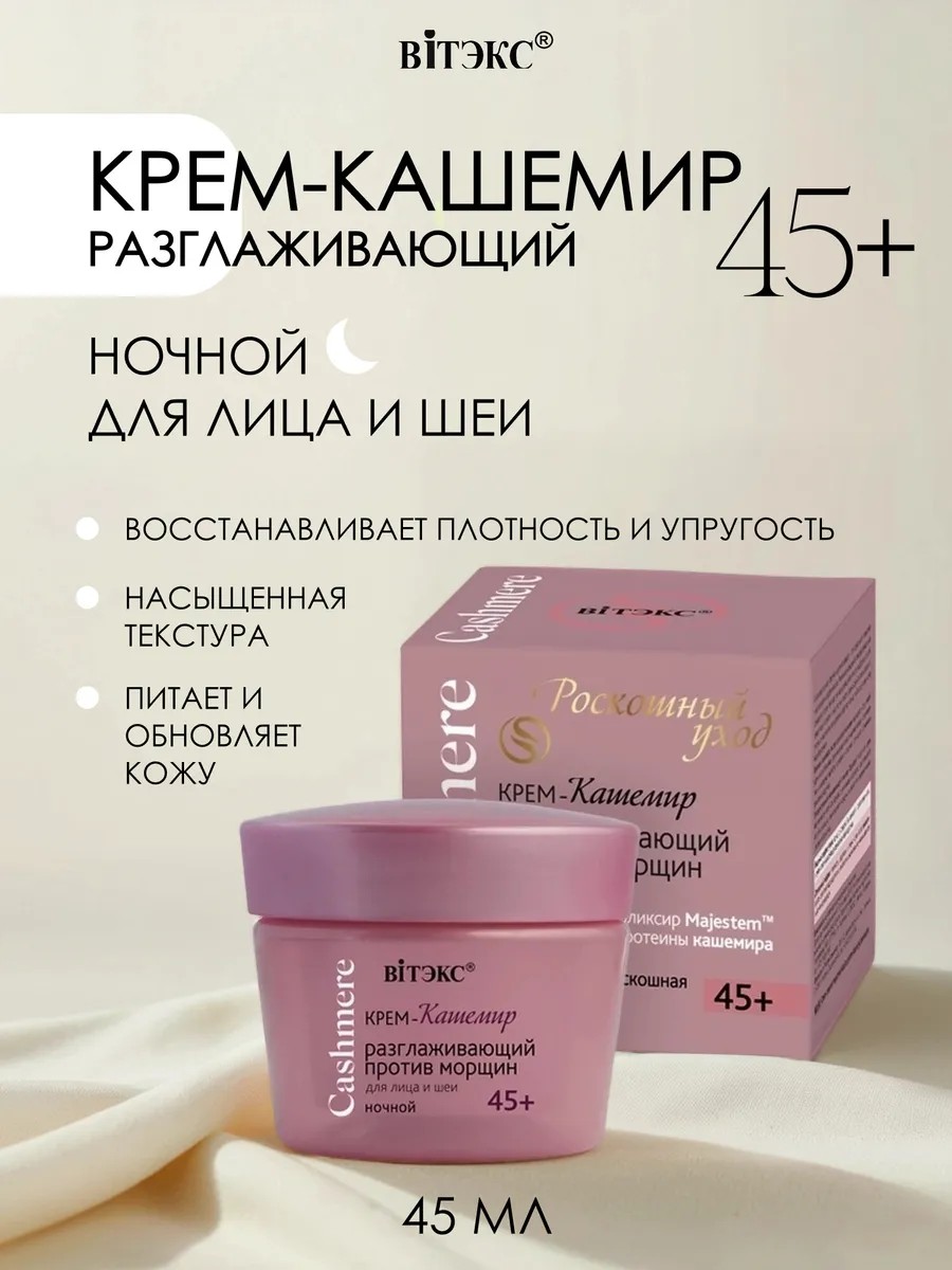Ночной разглаживающий крем "Кашемир" от Витэкс – это настоящий подарок для зрелой кожи 45+. Его уникальная формула, обогащенная протеинами кашемира и экстрактом розовой магнолии, работает в ночное время, когда кожа наиболее восприимчива к уходу. Крем интенсивно увлажняет, разглаживает морщины и способствует омоложению кожи, делая ее более упругой и сияющей. Легкая текстура крема быстро впитывается, не оставляя жирного блеска, и подходит для всех типов кожи. Пробудитесь утром с обновленной и отдохнувшей кожей, полной жизненной силы. Включите ночной крем "Кашемир" в свой ритуал ухода за собой и наслаждайтесь результатом!