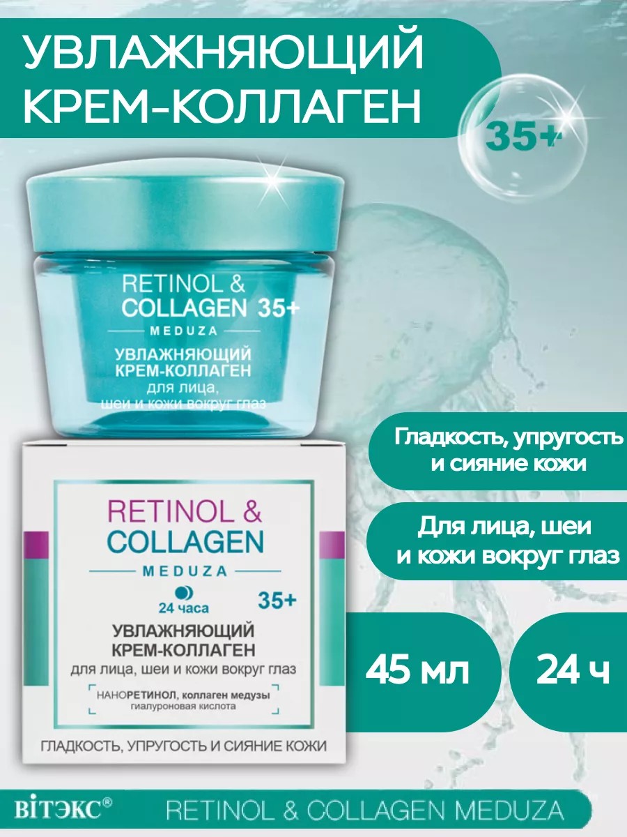 Витэкс Retinol&Collagen meduza 35+ Крем-коллаген для лица, шеи и глаз увлажняющий 24ч. Уникальная формула крема объединила в себе звездные омолаживающие и увлажняющие компоненты, которые запускают процессы обновления и омоложения кожи, предотвращая процессы старения. Наноретинол способствует деликатному обновлению кожи, обладает удивительной способностью разглаживать морщины и укреплять кожу, восстанавливая ее естественную красоту и молодость.Коллаген медузы поддерживает оптимальный уровень увлажнения, повышает упругость и эластичность кожи, предупреждает появление морщин.Гиалуроновая кислота и Tens Up глубоко увлажняют кожу, обеспечивают выраженный эффект лифтинга и разглаживания морщин. Экстракт красных водорослей восстанавливает уставшую кожу, уменьшает поры, придает коже здоровое естественное сияние, мягкость и бархатистость.