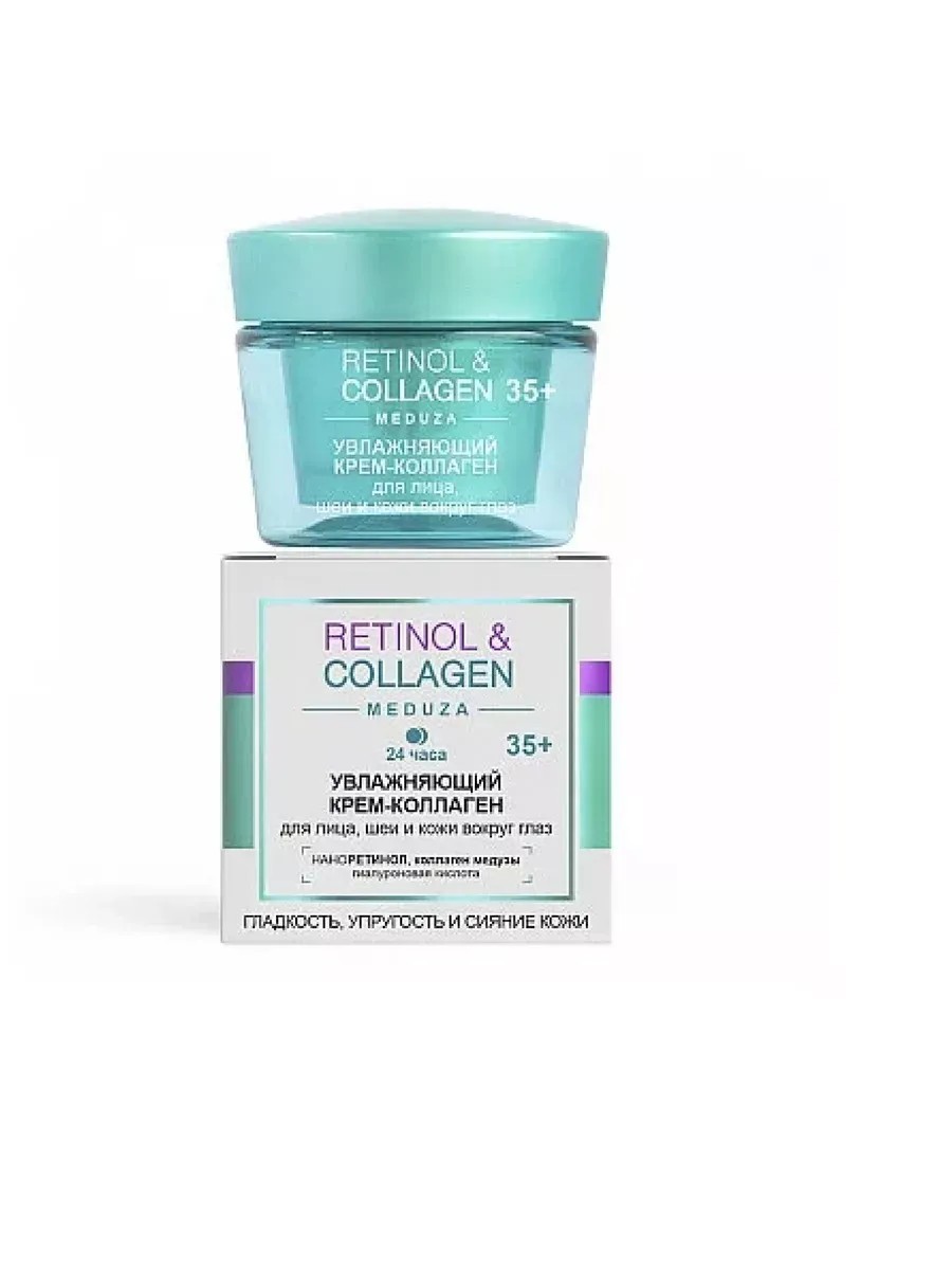 Витэкс, Крем-коллаген RETINOL&COLLAGEN meduza для лица, шеи, кожи вокруг глаз 35+ 45 мл, 1 шт. ГЛАДКОСТЬ, УПРУГОСТЬ и СИЯНИЕ кожи Уникальная формула крема объединила в себе «звездные» омолаживающие и увлажняющие компоненты, которые запускают процессы обновления и омоложения кожи, предотвращая процессы старения. Наноретинол способствует деликатному обновлению кожи, обладает удивительной способностью разглаживать морщины и укреплять кожу, восстанавливая ее естественную красоту и молодость. Коллаген медузы поддерживает оптимальный уровень увлажнения, повышает упругость и эластичность кожи, предупреждает появление морщин. Гиалуроновая кислота и Ten’s Up глубоко увлажняют кожу, обеспечивают выраженный эффект лифтинга и разглаживания морщин. Экстракт красных водорослей восстанавливает уставшую кожу, уменьшает поры, придает коже здоровое естественное сияние, мягкость и бархатистость