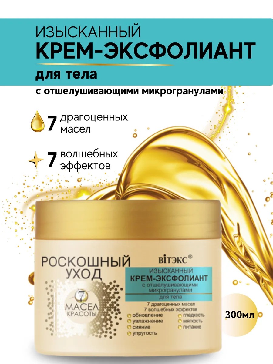 Изысканный крем-эксфолиант из серии "Роскошное питание 7 Масел красоты" обеспечит максимально деликатное отшелушивание ороговевших частичек эпидермиса, его активное обновление и восстановление. Благодаря уникальной формуле с ценными природными компонентами, разработанной передовыми специалистами белорусского бренда "Витэкс", кожный покров заметно преображается уже после первого применения, радуя своей невероятной гладкостью и мягкостью.