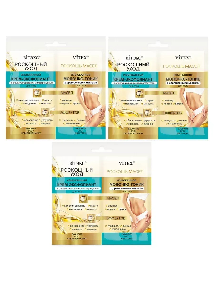 Витэкс крем-эксфолиант для тела + молочко, 3 шт. Изысканный крем-эксфолиант нежной шелковой текстуры содержит исключительно мягкие микросферы для бережного отшелушивания мертвевших клеток и удаления загрязнений без раз-дражения кожи. 7 ценнейших масел –сладкого миндаля, карите, арганы, персика, авокадо, макадамии и камелии сасанква –насыщают необходимыми питательными веществами, улучшают эластичность и