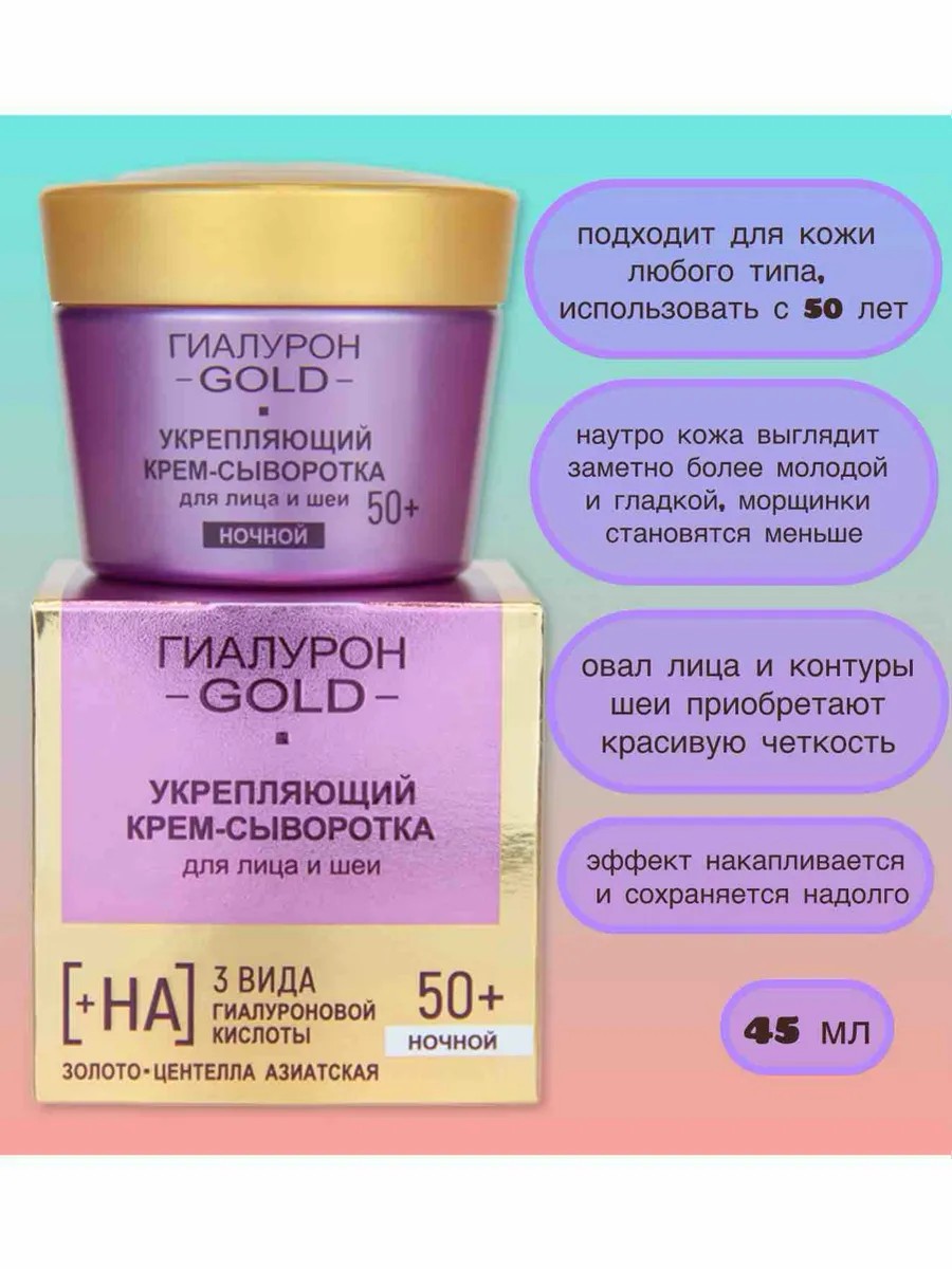 50+ КРЕМ-сыворотка НОЧНОЙ д/лица и шеи укрепляющ.,45мл, Гиалурон GOLD