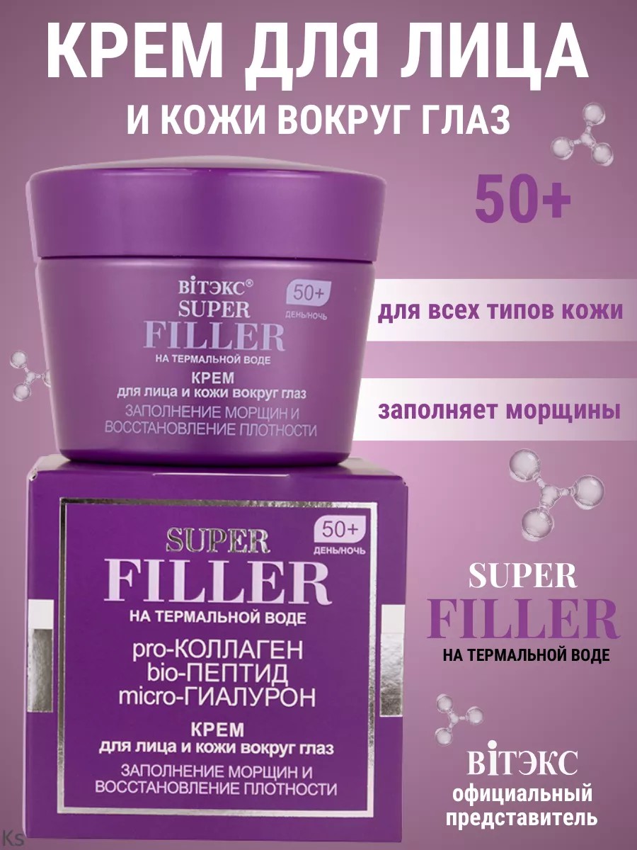 Крем для лица и кожи вокруг глаз Заполнение морщин и восстановление плотности 50+, день/ночь SUPER FILLER на термальной воде. Активная формула крема создана специально для восстановления плотности кожи, заполнения и уменьшения всех видов морщин, укрепление контуров лица в течение всего дня и всей ночи. Pro-активный коллаген подтягивает, укрепляет опорные волокна кожи, стимулирует выработку собственного коллагена, bio-миметический пептид заполняет и разглаживает морщины, придает сияние молодости. Молекулярный гиалурон и термальная вода наполняют влагой и повышают упругость кожи
