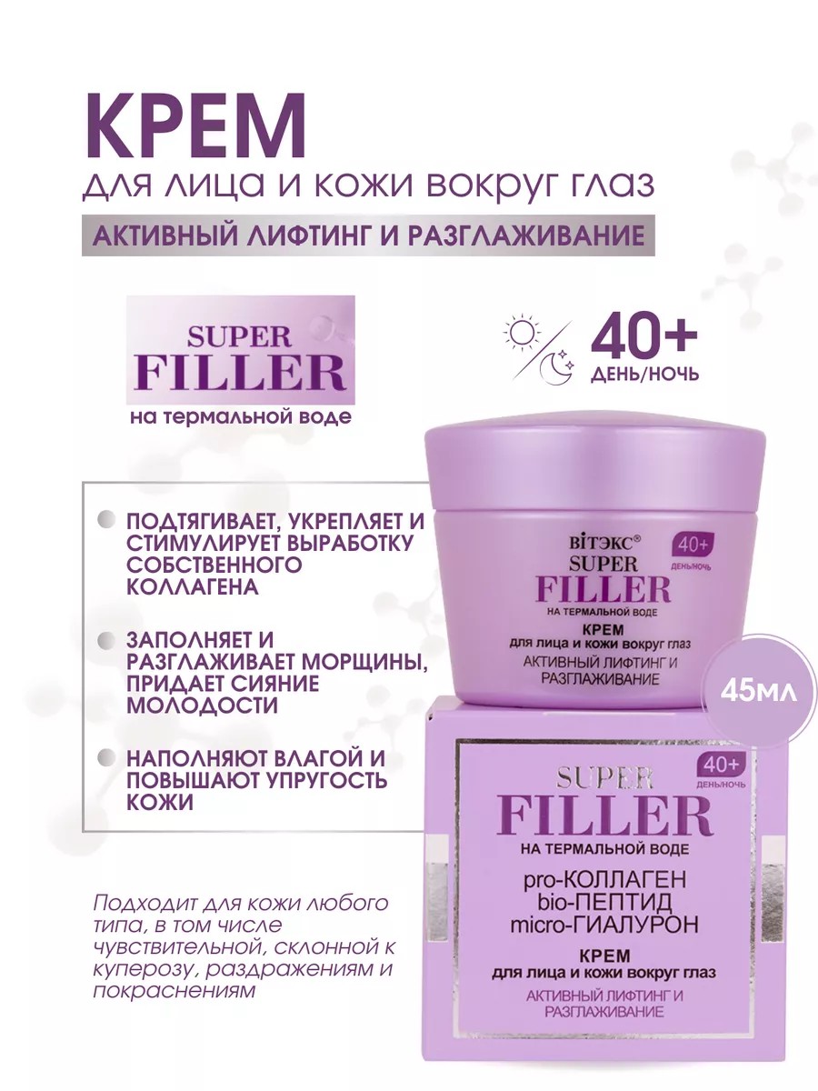 | Комплектация | Крем для лица и кожи вокруг глаз на термальной воде 40+ SUPER FILLER |