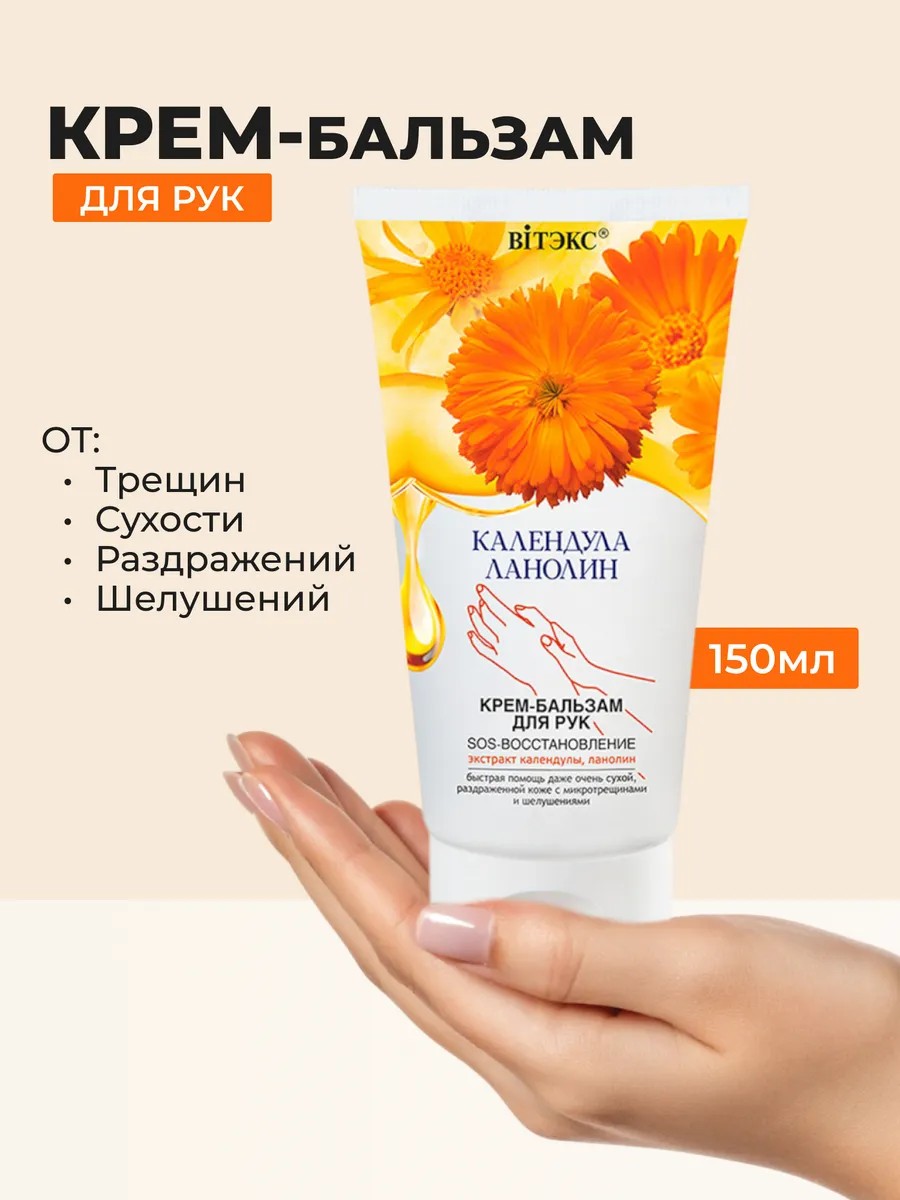 Календула & ланолин крем-бальзам для рук sos-восстановление. Показания к применению: - сухая, обветренная, загрубевшая кожа, - микротрещинки, шелушение и раздражение, - потеря гладкости и мягкости. Насыщенный крем-бальзам для рук совмещает в себе комфорт питательного крема и усиленное восстанавливающее действие активного бальзама. Идеальное средство для sos-помощи сухой, раздраженной коже с микротрещинами и шелушениями. Ланолин – один из наиболее эффективных питательных и восстанавливающих компонентов – благодаря великолепной совместимости с кожей мягко встраивается в гидролипидный слой эпидермиса, насыщает влагой, способствует заживлению микроповреждений, усиливает регенерацию клеток, возвращает коже нежность и гладкость. Масло кокоса быстро улучшает состояние сухой и раздраженной кожи, глубоко питает, устраняет шелушение, смягчает кутикулу, делает кожу мягкой и ухоженной. Экстракт календулы и бисаболол оказывают оздоравливающее, антимикробное и противовоспалительное действие, снимают раздражение и покраснение, улучшают процессы восстановления, способствуют заживлению микротрещин, повышают эластичность кожи. Результат: глубоко увлажненная, гладкая и мягкая кожа без шелушений и трещинок. Применение: нанесите на чистую кожу, помассируйте до полного впитывания.