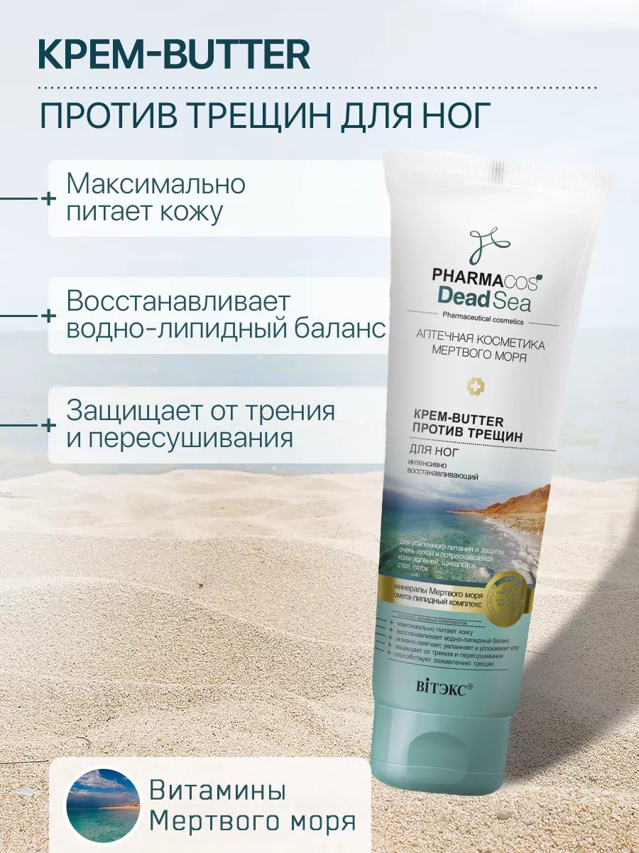 Для усиленного питания и защиты очень сухой и потрескавшейся кожи коленей, щиколоток, стоп, пяток. Крем-butter разработан специально для ухода за кожей ног, склонной к сухости и появлению трещин. Насыщенная формула содержит специально разработанный омега-липидный комплекс и целебные минералы Мертвого моря для интенсивного восстановления, смягчения и оздоровления кожи ног. Активные компоненты: Микрокристаллы 20 минералов Мертвого моря восстанавливают водно-липидный и минеральный баланс в клетках, укрепляют защитные механизмы кожи, тонизируют, повышают эластичность и гладкость кожи. Омега-кислоты эффективно снимают сухость и шелушение, восстанавливают защитный липидный слой кожи, повышают плотность кожи, усиливают естественные защитные механизмы. Ценные масла кунжута, бабассу, какао и кокоса максимально насыщают клетки незаменимыми питательными веществами, активно смягчают, придают упругость, эластичность и гладкость. Гель алоэ вера глубоко увлажняет кожу, поддерживая оптимальный водный баланс в клетках. Аллантоин и ланолин благодаря синергетическому действию великолепно смягчают сухую кожу, быстро возвращая ощущение комфорта и легкости, способствуют заживлению трещин и препятствуют их появлению. Мочевина – высокоэффективный увлажнитель, который быстро улучшает состояния кожи, вызванные сухостью. Помогает клеткам быстрее восстанавливаться и обновляться, ускоряя процесс заживления микроповреждений кожи, и улучшает барьерную функцию кожи.