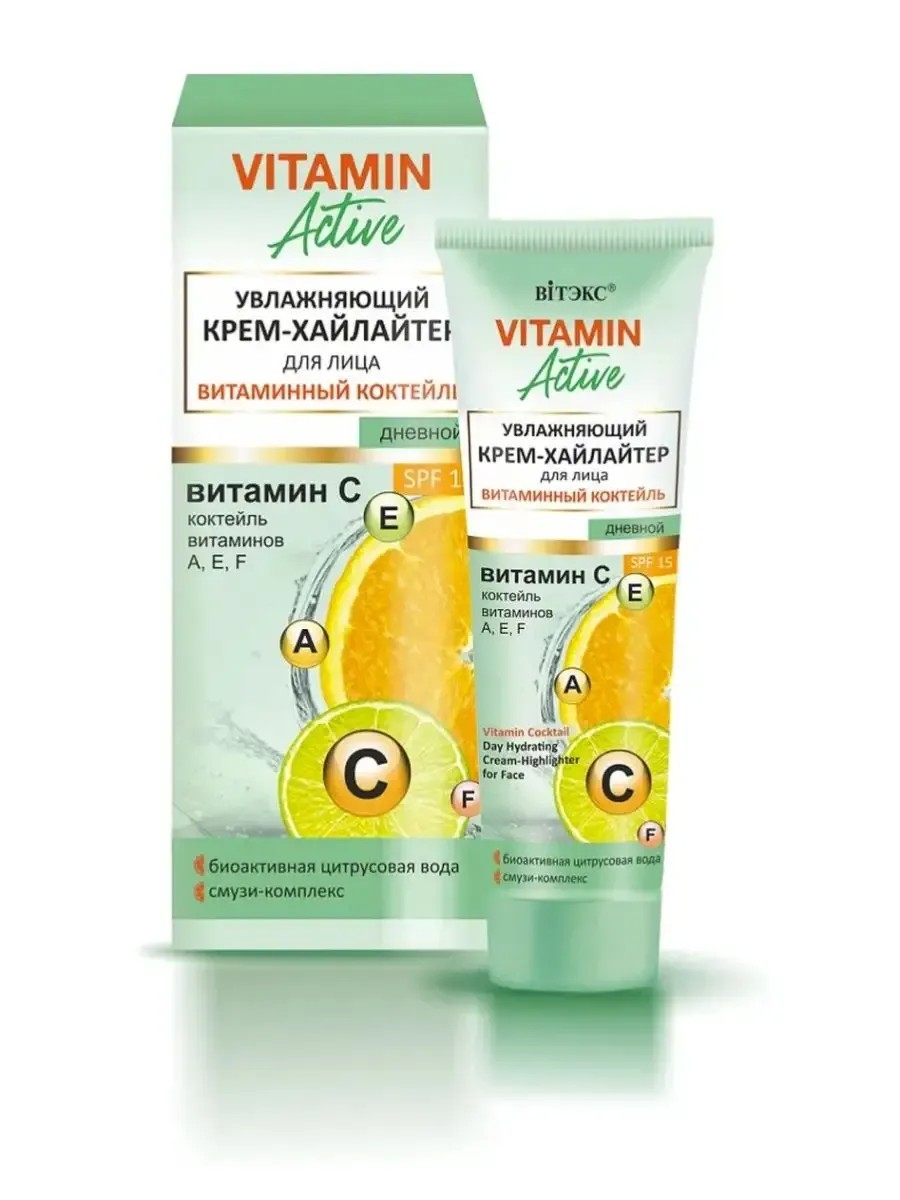Витэкс Vitamin active, Увлажняющий крем-хайлайтер для лица Витаминный коктейль Дневной 40 мл. Нежный, шелковистый крем-хайлайтер - это настоящий коктейль-энергетик для кожи, которая нуждается в витаминной подпитке. Витамин С в стабилизированной форме длительное время сохраняет высокую активность и, глубоко проникая в кожу, действует особенно эффективно: - благодаря сильнейшим антиоксидантным свойствам, предохраняет кожу от негативного влияния свободных радикалов; - стимулирует выработку собственного коллагена, заметно улучшает упругость кожи, препятствует появлению морщинок; - снижает синтез меланина, мягко осветляет веснушки, пигментные пятна и следы постакне, делает цвет лица чистым, ровным и нежным. Применение: нанесите крем-хайлайтер утром на очищенную кожу.