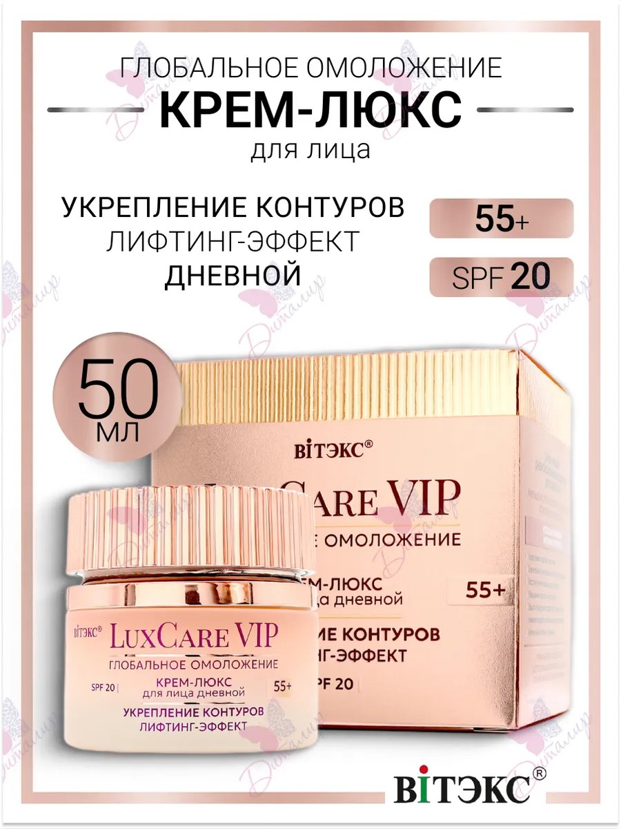 Luxcare vip глобальное омоложение крем-люкс 55+ дневной для лица укрепление контуров, лифтинг-эффект, spf 20. Самый эффективный дневной омолаживающий крем для возраста 55+ • укрепление и подтяжка овала лица • значительное уменьшение мелких и глубоких морщин • восстановление объема и плотности кожи • повышение упругости и эластичности • защита от вредного воздействия солнечных лучей, появления возрастной пигментации и фотостарения • интенсивное питание, увлажнение. Премиальное качество luxcare vip – быстрое уменьшение возрастных изменений, стойкий выраженный эффект омоложения. Откройте для себя необыкновенно богатую, насыщенную формулу и роскошную шелковистую текстуру крема, созданного экспертами витэкс для видимого лифтинга контуров лица и уменьшения глубины морщин и заломов. Эксклюзивный коктейль компонентов с интенсивным антивозрастным действием работает на всех уровнях эпидермиса и быстро делает кожу визуально моложе: разглаживает, подтягивает, освежает, придает сияние упругости. Сразу после нанесения крема на коже образуется невесомая омолаживающая вуаль, которая оказывает подтягивающее и разглаживающее действие. Применение: нанесите утром на очищенную кожу лица, шеи и декольте.
