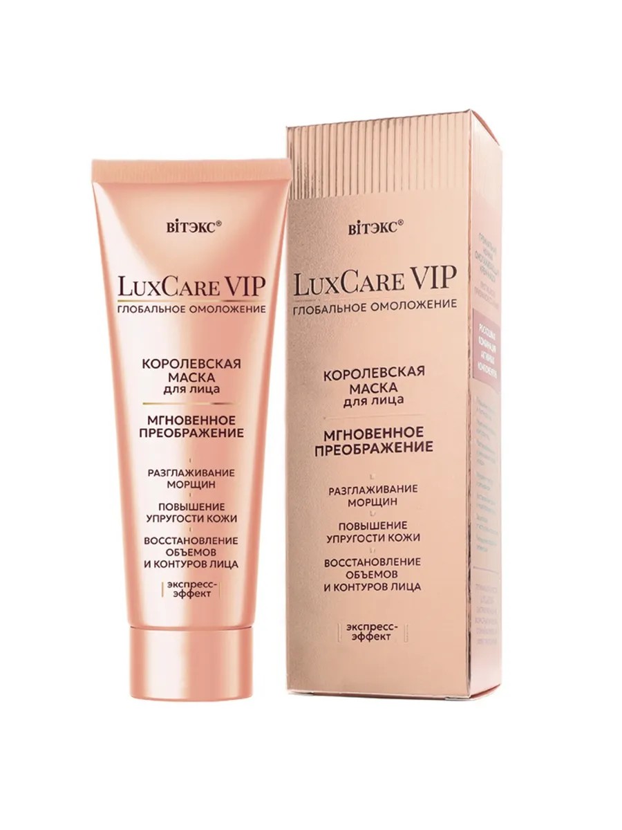 Lux Care VIP ROYAL INSTANT TRANSFORMATION Face Mask, 75ml. PREMIUM QUALITY LUXCARE VIP – RAPID REDUCTION OF AGE-RELATED CHANGES, LASTING, PROMINENT REJUVENATING EFFECT. Discover the royally rich, intense formula and luxurious silky texture of this mask, created by VITEX experts for an instant skin transformation. Premium rejuvenating ingredients remove signs of fatigue, stress, and lack of sleep in just minutes, tighten and smooth the skin, giving it a delightfully youthful, fresh, and well-groomed appearance. The ANTIAGE COMPLEX works against all the main signs of skin aging: it fills in wrinkles and literally pushes them out from the inside, restores facial contours, and restores the elasticity, smoothness, and fullness characteristic of younger skin. PROXILAN strengthens and restores the skin's collagen-elastin framework, provides a lifting effect, remodels and sculpts facial contours, and reduces the depth of wrinkles and fine lines. ADENOSINE, a next-generation anti-aging ingredient, actively stimulates the production of collagen, elastin, and hyaluronic acid, visibly reducing the number and severity of all types of wrinkles, improving skin firmness and density. GLUCOSAMINE normalizes skin hydration, brightens and evens skin tone, prevents loss of elasticity, and reduces signs of UV-induced photoaging. CENTELLA ASIATICA accelerates metabolic processes in the epidermis, improves skin elasticity and hydration, soothes redness and irritation, and helps reduce facial puffiness.