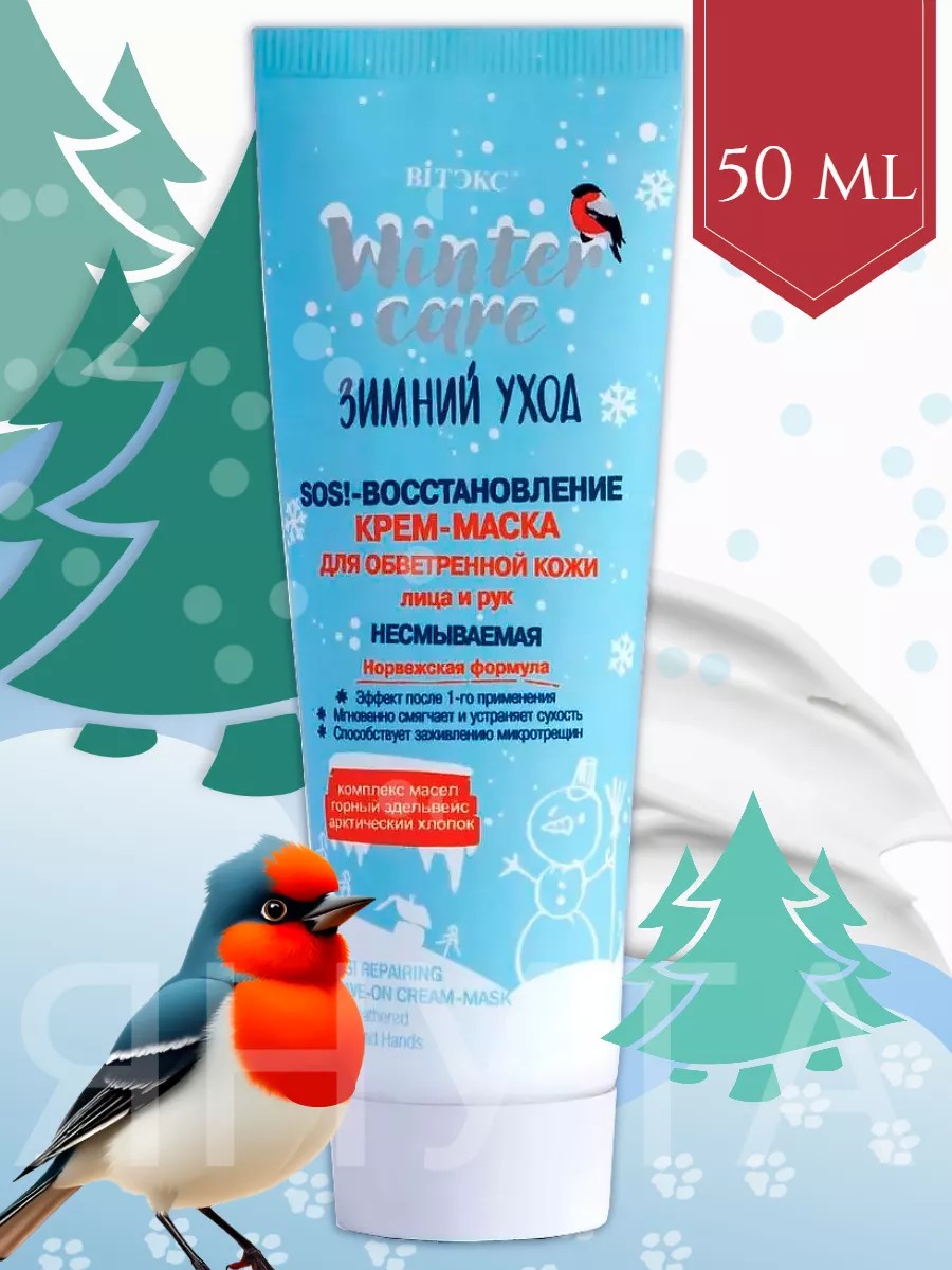 Sos-восстановление крем-маска для обветренной кожи лица и рук несмываемая линии WINTER CARE ЗИМНИЙ УХОД 50 мл. Комплекс масел, горный эдельвейс, арктический хлопок. Норвежская формула. Мгновенно смягчает и устраняет сухость кожи; способствует заживлению микротрещин, восстанавливает защитные функции кожи. Крем-маска – необходимое SOS-средство для экстренной помощи коже, ослабленной вследствие негативного влияния холода, ветра и непогоды. Уникальный комплекс активных компонентов (масла ши, арганы, макадамии, бабассу и хлопка, целебные клетки горного эдельвейса, D-пантенол) помогают быстро реанимировать кожу после обветривания и обморожения: интенсивно питают и увлажняют, восполняют дефицит витаминов и микроэлементов, восстанавливают гидролипидный слой в местах сильного шелушения кожи. Насыщенная кремовая текстура при нанесении на кожу тает, превращаясь в нежное шелковистое масло, которое быстро и легко впитывается, оставляя кожу мягкой, гладкой и ухоженной. Применение: наносите на чистую кожу мягкими массажными движениями.