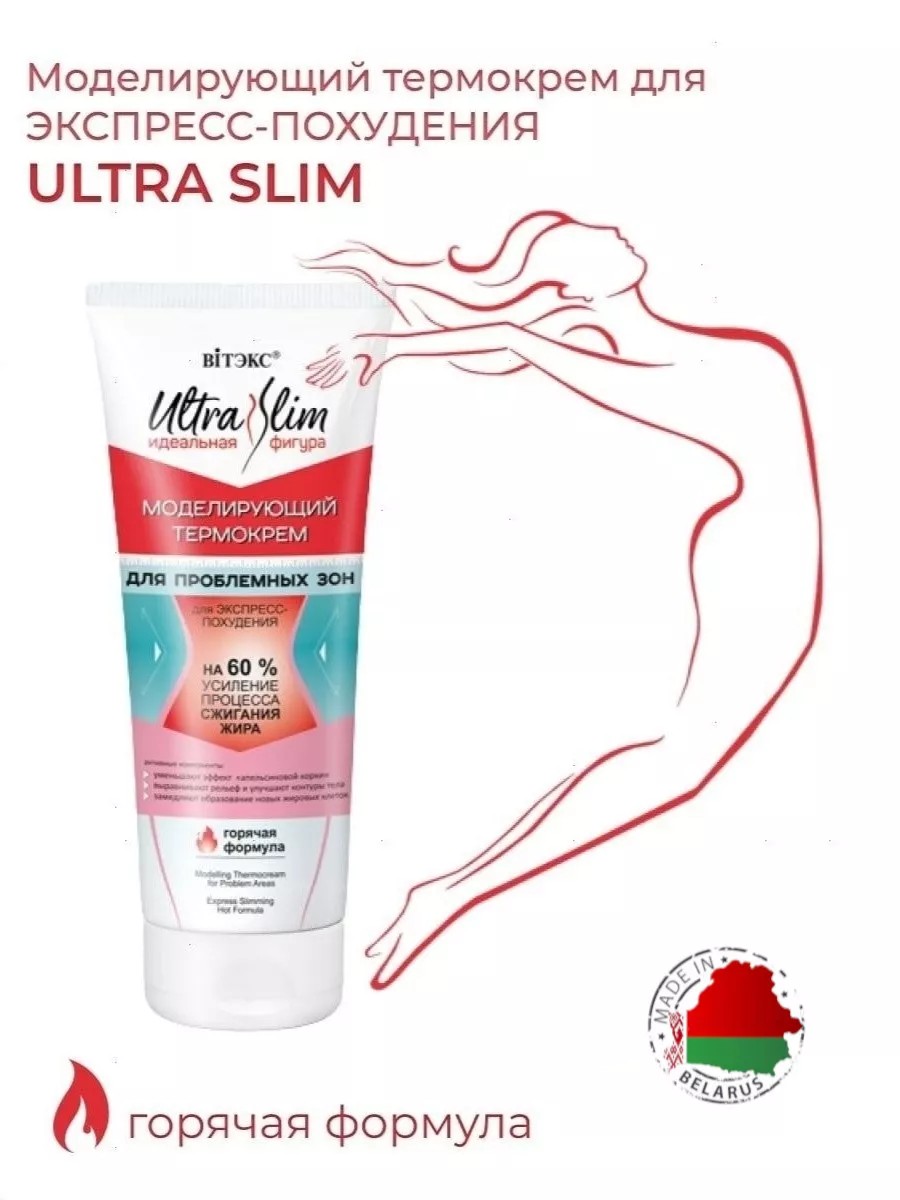 Cерия Белорусской косметики от Витэкс для похудения и коррекции внешнего вида Вашего тела. Представляем Вашему вниманию незаменимого помощника в борьбе с лишним весом – Набор Ultra Slim Моделирующий термокрем для проблемных зон + Липодренажная слимминг-маска для живота и талии. Набор Vitex Ultra Slim Идеальная фигура представляет собой крема для похудения, созданные на основе контрастного эффекта – холодная формула и горячая формула.Моделирующий крем для похудения разработан специально для похудения в кратчайшие сроки. Активная формула Ultra Slim Thermocream с красным перцем сразу после нанесения на кожу создает «тепловую пленку», позволяя доставить компоненты в глубокие слои кожи, что помогает быстро избавиться от нежелательных сантиметров и от эффекта «апельсиновая корка». Антицеллюлитный крем для похудения Белорусская косметика особенно рекомендуется наносить в период диет и во время спорта в качестве дополнительной экспресс-программ. Антицеллюлитная маска для живота и талии содержит в себе эффективные натуральные ингредиенты: водоросли Вакаме, стимулирующие активное выделение лишней жидкости и токсинов из организма; Кофеин ускоряет сжигание жира; Ягоды годжи обладают антиоксидантными свойствами, улучшают выработку коллагена; Масло кокоса и масло жожоба дарят коже гладкость. VITEX Термокрем для коррекции фигуры и Маска от целлюлита содержат также комплекс Pro-Sveltyl, способствующий уменьшению окружности талии до 5 см и объема бедер до 4 см всего за 8 недель использования! НЕ ТРЕБУЕТ СМЫВАНИЯ!