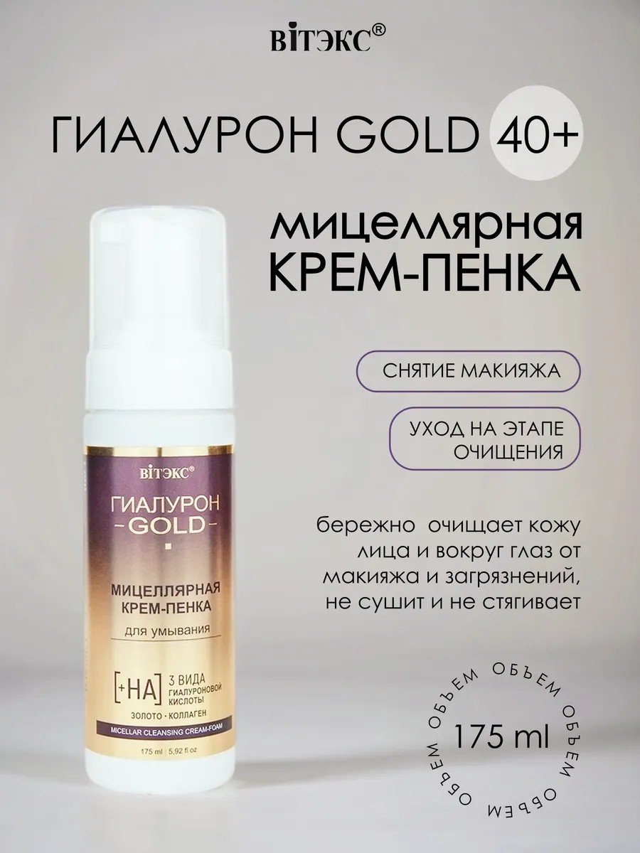 Vitex Hyaluron GOLD Micellar Cleansing Foam Cream is a gentle and effective cleanser for the face and eyelids. Its unique formula, enriched with hyaluronic acid and colloidal gold, not only removes makeup and impurities but also deeply moisturizes, leaving skin radiant and firm. Coco-betaine provides gentle cleansing, while desamidocollagen helps smooth wrinkles. This foam is suitable for all skin types, even sensitive skin. Its delicate texture transforms into a silky lather that rinses easily without leaving a tight feeling. Regular use of Hyaluron GOLD Cream-Foam Cream will leave your skin feeling fresh, clean, and radiant.